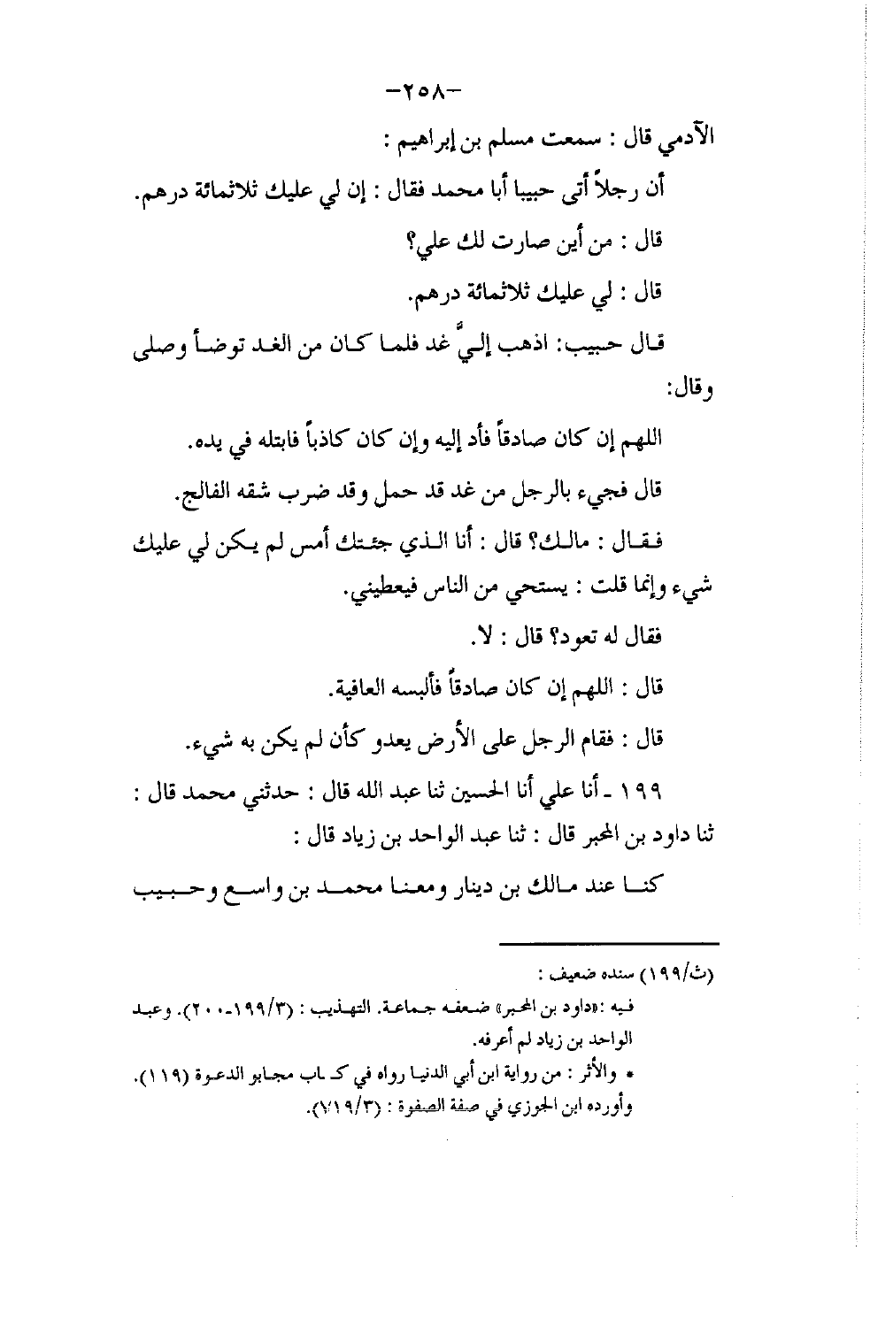 199 - أنا عَلِيٌّ، أنا الْحُسَيْنُ، ثنا عَبْدُ اللَّهِ، قَالَ: حَدَّثَنِي مُحَمَّدٌ، قَالَ: ثنا دَاوُدُ بْنُ الْمُحَبَّرِ، قَالَ: ثنا عَبْدُ الْوَاحِدِ بْنُ زِيَادٍ، قَالَ: كُنَّا عِنْدَ مَالِكِ بْنِ دِينَارٍ وَمَعَنَا مُحَمَّدُ بْنُ وَاسِعٍ وَحَبِيبٌ -[259]- أَبُو مُحَمَّدٍ فَجَاءَ رَجُلٌ وَكَلَّمَ مَالِكًا وَأَغْلَظَ فِي قِسْمَةٍ قَسَمَهَا وَقَالَ: وَضَعْتَهَا فِي غَيْرِ حَقِّهَا وَتَتَبَّعْتَ بِهَا أَهْلَ مَجْلِسِكَ وَمَنْ يَغْشَاكَ لِتُكْثِرَ غَاشِيَتَكَ وَتَصْرِفَ وُجُوهَ النَّاسِ إِلَيْكَ، قَالَ: فَبَكَى مَالِكٌ وَقَالَ: §وَاللَّهِ مَا أَرَدْتُ هَذَا، قَالَ: بَلَى وَاللَّهِ لَقَدْ أَرَدْتَهُ بِهَذَا فَجَعَلَ مَالِكٌ يَبْكِي وَالرَّجُلُ يُغْلِظُ لَهُ، فَلَمَّا أَكْثَرَ ذَلِكَ عَلَيْهِ رَفَعَ حَبِيبٌ يَدَيْهِ إِلَى السَّمَاءِ ثُمَّ قَالَ: اللَّهُمَّ إِنَّ هَذَا قَدْ شَغَلَنَا عَنْ ذِكْرِكَ فَأَرِحْنَا مِنْهُ كَيْفَ شِئْتَ، فَسَقَطَ وَاللَّهِ الرَّجُلُ عَلَى وَجْهِهِ مَيِّتًا فَحُمِلَ إِلَى أَهْلِهِ عَلَى سَرِيرٍ وَكَانَ يُقَالُ إِنَّ أَبَا مُحَمَّدٍ مُسْتَجَابُ الدَّعْوَةِ
