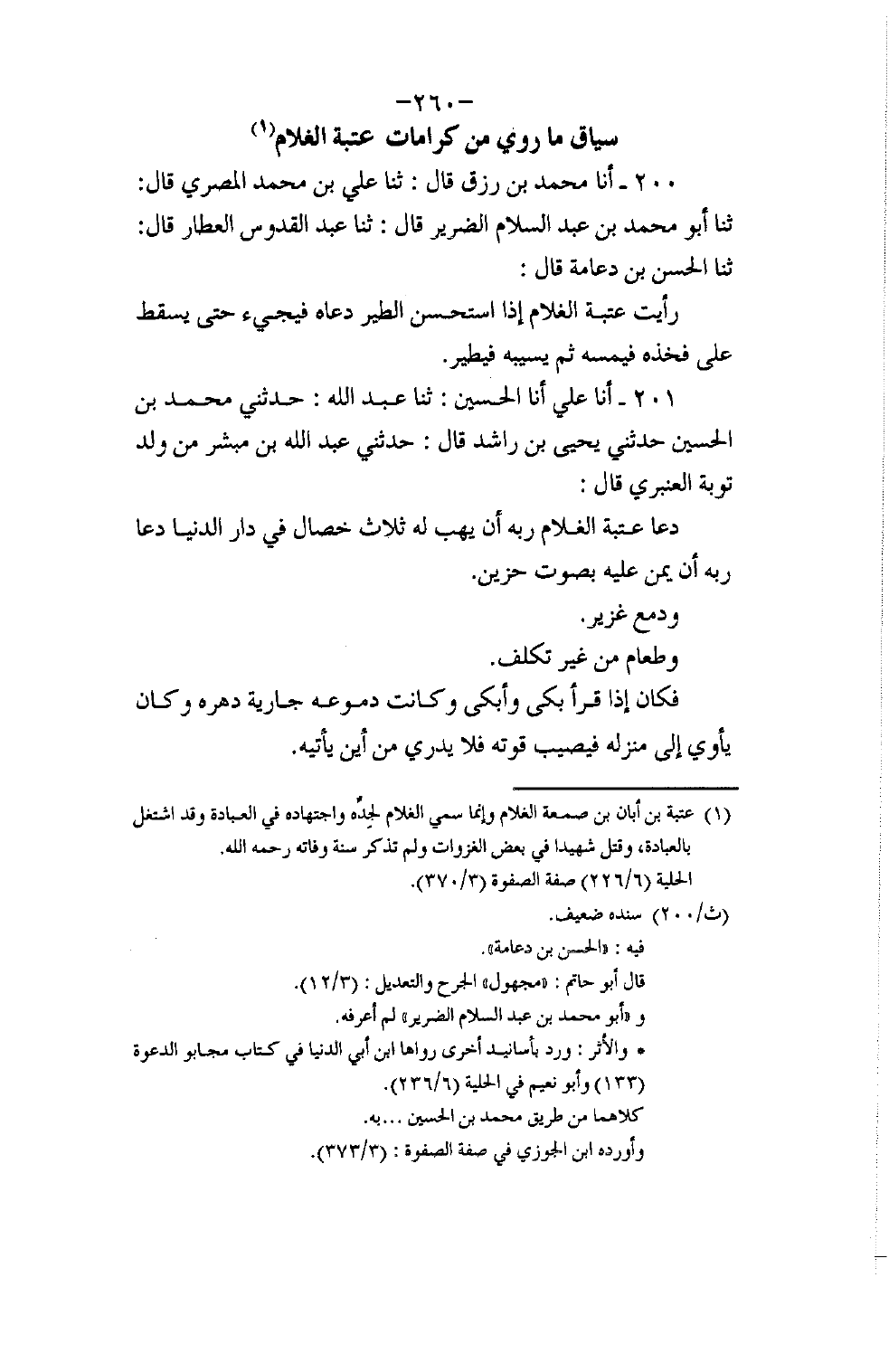 201 - أنا عَلِيٌّ، أنا الْحُسَيْنُ، ثنا عَبْدُ اللَّهِ، حَدَّثَنِي مُحَمَّدُ بْنُ الْحُسَيْنِ، حَدَّثَنِي يَحْيَى بْنُ رَاشِدٍ، قَالَ: حَدَّثَنِي عَبْدُ اللَّهِ بْنُ مُبَشِّرٍ مِنْ وَلَدِ تَوْبَةَ الْعَنْبَرِيِّ، قَالَ: §دَعَا عُتْبَةُ الْغُلَامُ رَبَّهُ أَنْ يَهَبَ لَهُ ثَلَاثَ خِصَالٍ فِي دَارِ الدُّنْيَا دَعَا رَبَّهُ أَنْ يَمُنَّ عَلَيْهِ بِصَوْتٍ حَزِينٍ، وَدَمْعٍ غَزِيرٍ، وَطَعَامٍ مِنْ غَيْرِ تَكَلُّفٍ، فَكَانَ إِذَا قَرَأَ بَكَى وَأَبْكَى، وَكَانَتْ دُمُوعُهُ جَارِيَةً دَهْرَهُ، وَكَانَ يَأْوِي إِلَى مَنْزِلِهِ فَيُصِيبُ قُوتَهُ فَلَا يَدْرِي مِنْ أَيْنَ يَأْتِيهِ