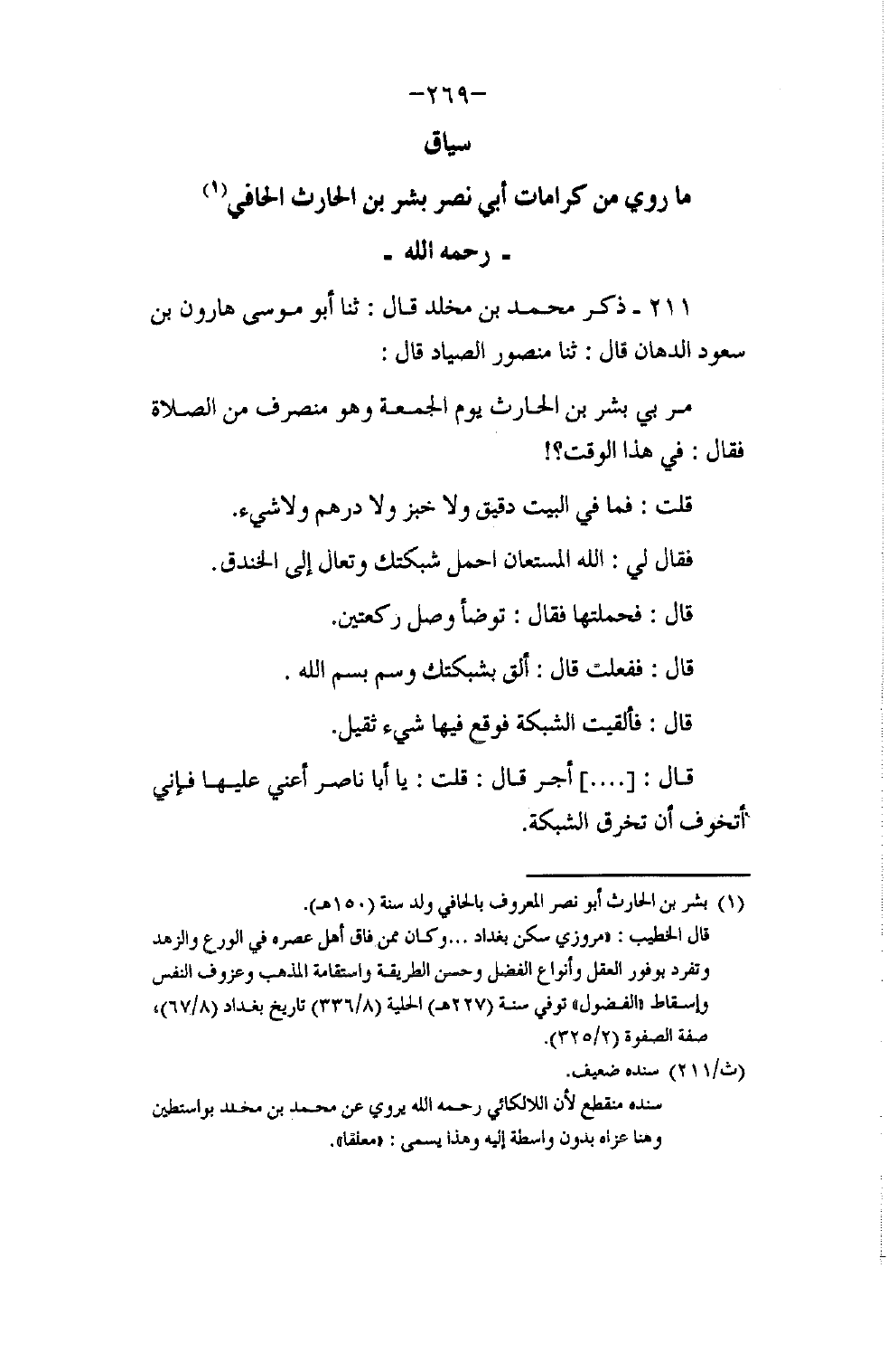 §سِيَاقُ مَا رُوِيَ مِنْ كَرَامَاتِ أَبِي نَصْرٍ بِشْرِ بْنِ الْحَارِثِ الْحَافِي رَحِمَهُ اللَّهُ