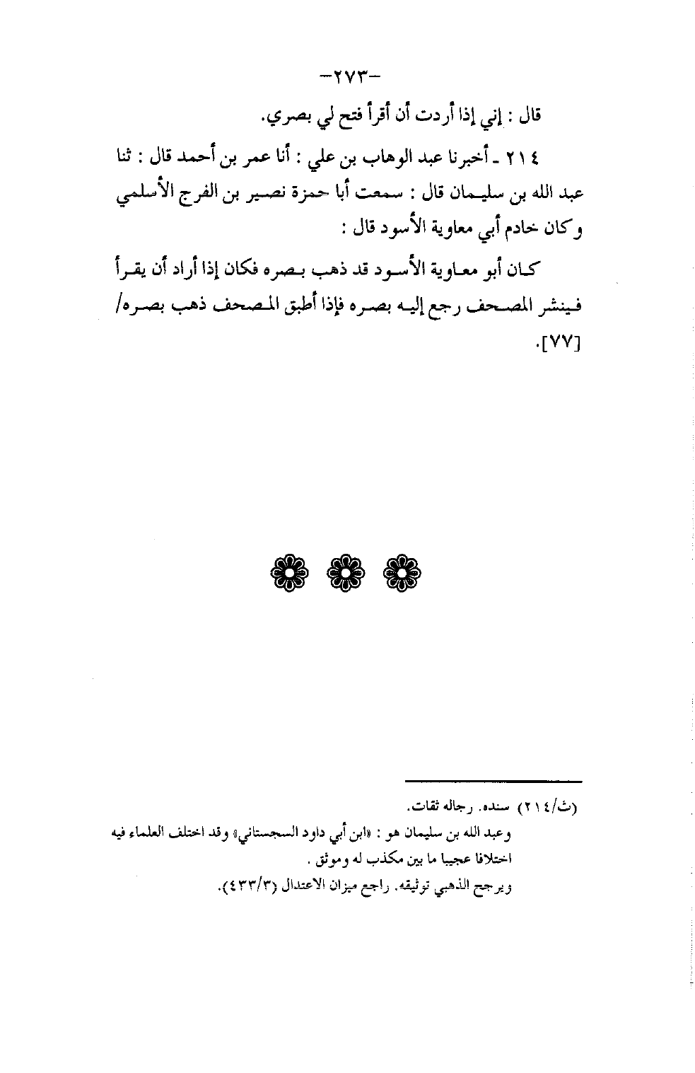 214 - أخبرنا عَبْدُ الْوَهَّابِ بْنُ عَلِيٍّ، أنا عُمَرُ بْنُ أَحْمَدَ، قَالَ: ثنا عَبْدُ اللَّهِ بْنُ سُلَيْمَانَ، قَالَ: سَمِعْتُ أَبَا حَمْزَةَ نُصَيْرَ بْنَ الْفَرَجِ الْأَسْلَمِيَّ وَكَانَ خَادِمَ أَبِي مُعَاوِيَةَ الْأَسْوَدِ، قَالَ: كَانَ أَبُو مُعَاوِيَةَ الْأَسْوَدُ قَدْ ذَهَبَ بَصَرُهُ فَكَانَ §إِذَا أَرَادَ أَنْ يَقْرَأَ فَيَنْشُرُ الْمُصْحَفَ رَجَعَ إِلَيْهِ بَصَرُهُ فَإِذَا أَطْبَقَ الْمُصْحَفَ ذَهَبَ بَصَرُهُ