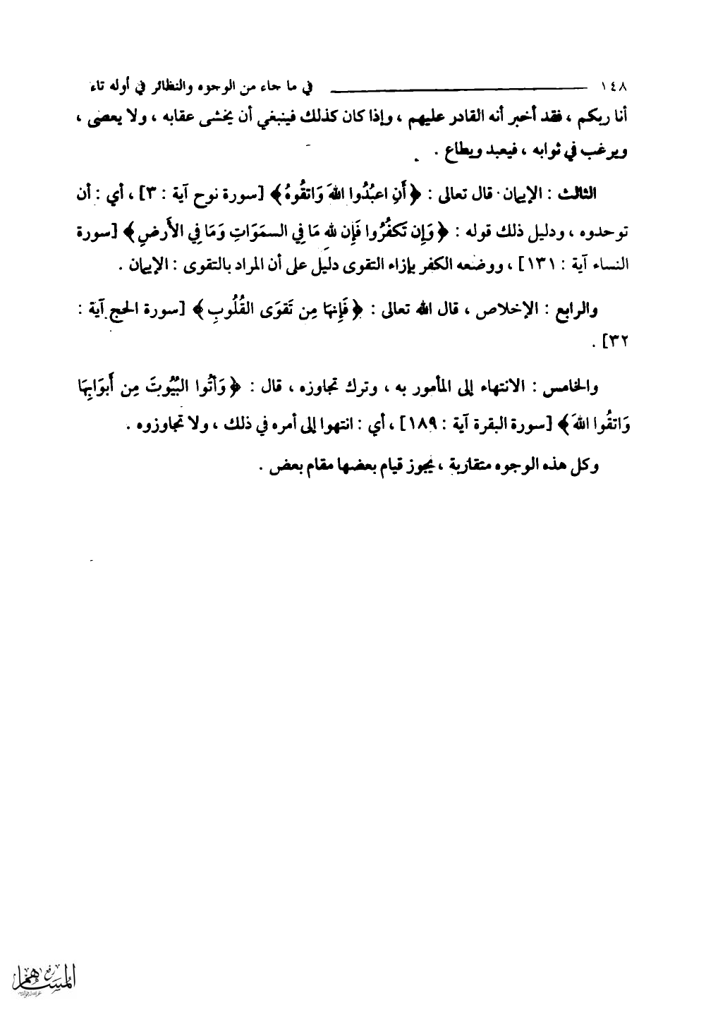 الثالث: الإيمان. قال تعالى: (أَنِ اعْبُدُوا اللَّهَ وَاتَّقُوهُ) أي: أن توحدوه، ودليل ذلك قوله: (وَإِنْ تَكْفُرُوا فَإِنَّ لِلَّهِ مَا فِي السَّمَاوَاتِ وَمَا فِي الْأَرْضِ). ووضعه الكفر بإزاء التقوى دليل على أن المراد بالتقوى: الإيمان.