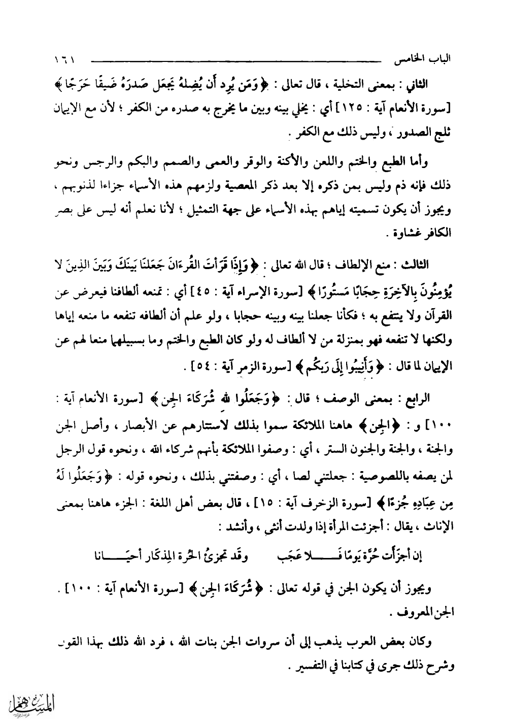 الرابع: بمعنى الوصف؛ قال: (وَجَعَلُوا لِلَّهِ شُرَكَاءَ الْجِنَّ) و: (الْجِنَّ) هاهنا الملائكة سموا بذلك لاستتارهم عن الأبصار، وأصل الجن والجِنَّة، والجَنَّة والجنون الستر، أي: وصفوا الملائكة بأنهم شركاء الله، ونحوه قول الرجل لمن يصفه باللصوصية: جعلتني لصا، أي: وصفتني بذلك، ونحوه قوله: (وَجَعَلُوا لَهُ مِنْ عِبَادِهِ جُزْءًا) قال بعض أهل اللغة: الجزء هاهنا بمعنى الإناث، يقال: أجزئت المرأة إذا ولدت أنثي، وأنشد: