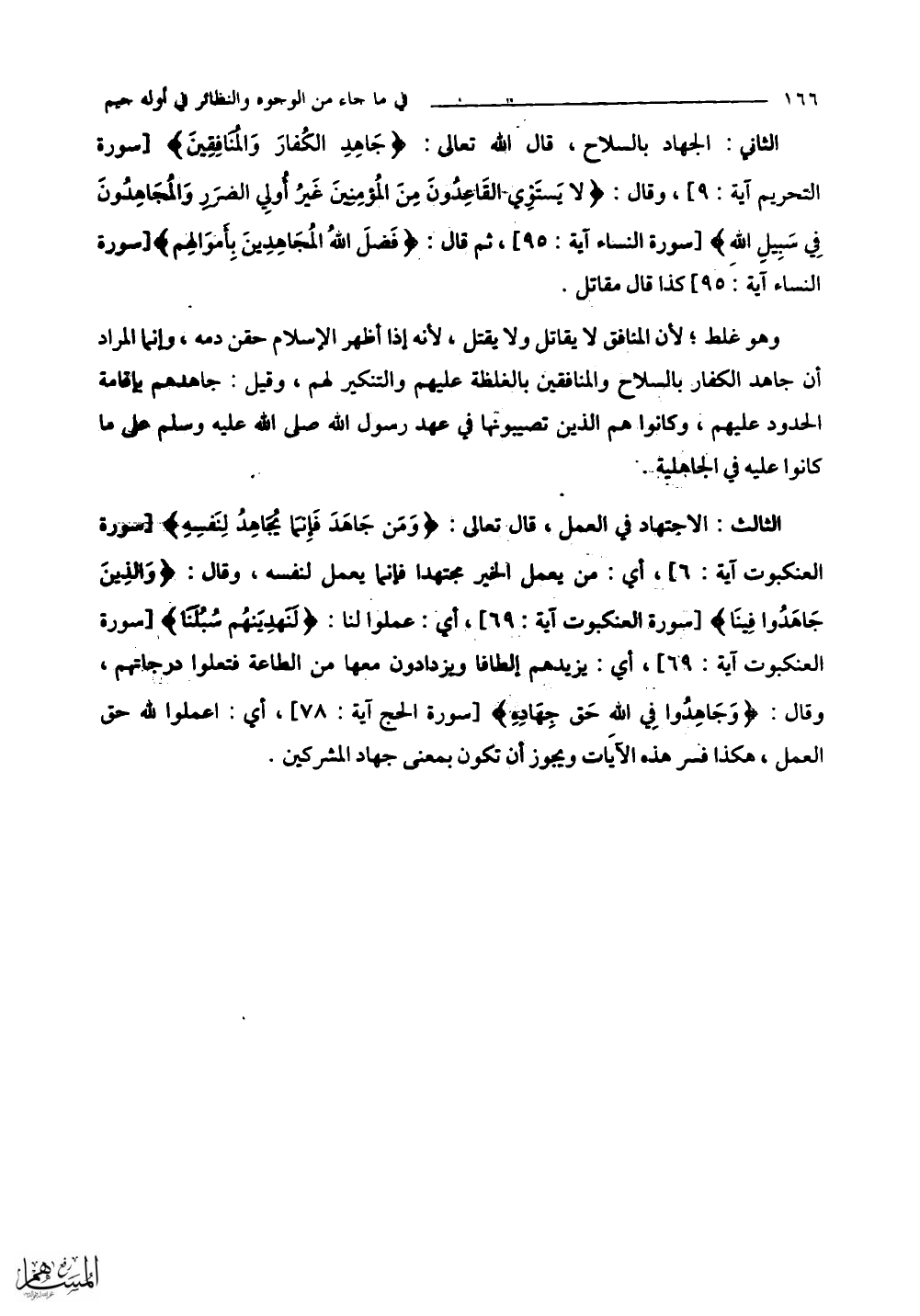 الثاني: الجهاد بالسلاح، قال اللَّه تعالى: (جَاهِدِ الكُفارَ وَالمنُافِقِينَ) وقال: (لَا يَسْتَوِي الْقَاعِدُونَ مِنَ الْمُؤْمِنِينَ غَيْرُ أُولِي الضَّرَرِ وَالْمُجَاهِدُونَ فِي سَبِيلِ اللَّهِ) ثم قال: (فَضَّلَ اللَّهُ الْمُجَاهِدِينَ بِأَمْوَالِهِمْ) كذا قال مقاتل.