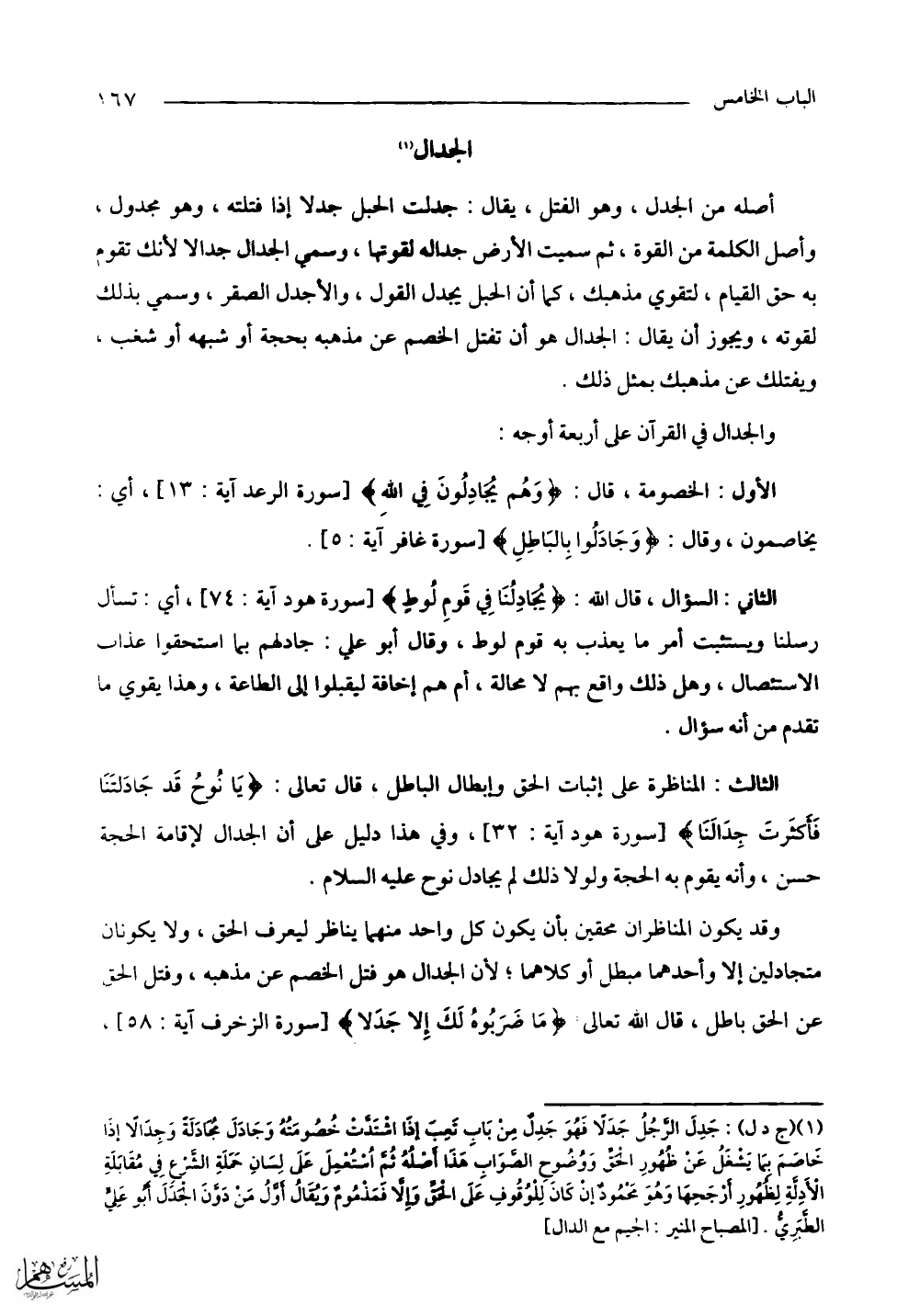 الأول: الخصومة، قال: (وَهُم يجادِلُونَ فِي الله)، أي: يخاصمون، وقال: (وَجَادَلُوا بِالبَاطِلِ).