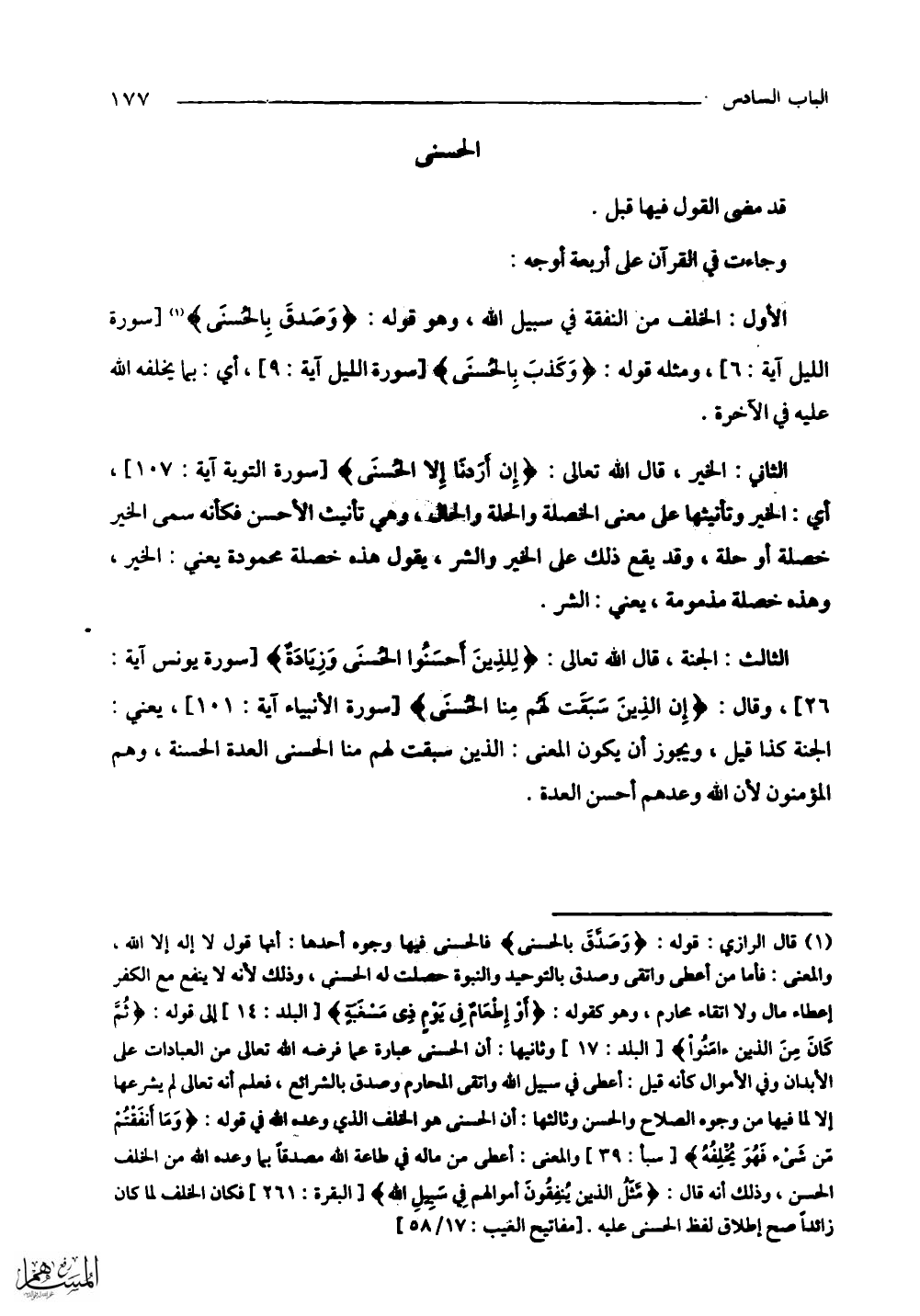 الثاني: الخير، قال اللَّه تعالى: (إِنْ أَرَدْنَا إِلَّا الْحُسْنَى) أي: الخير وتأنيثها على معنى الخصلة والحلة والحال، وهي تأنيث الأحسن فإنه سمى الخير خصلة أو حلة، وقد يقع ذلك على الخير والشر، قول هذه خصلة محمودة يعني: الخير، وهذه خصلة مذمومة، يعنى: الشر.