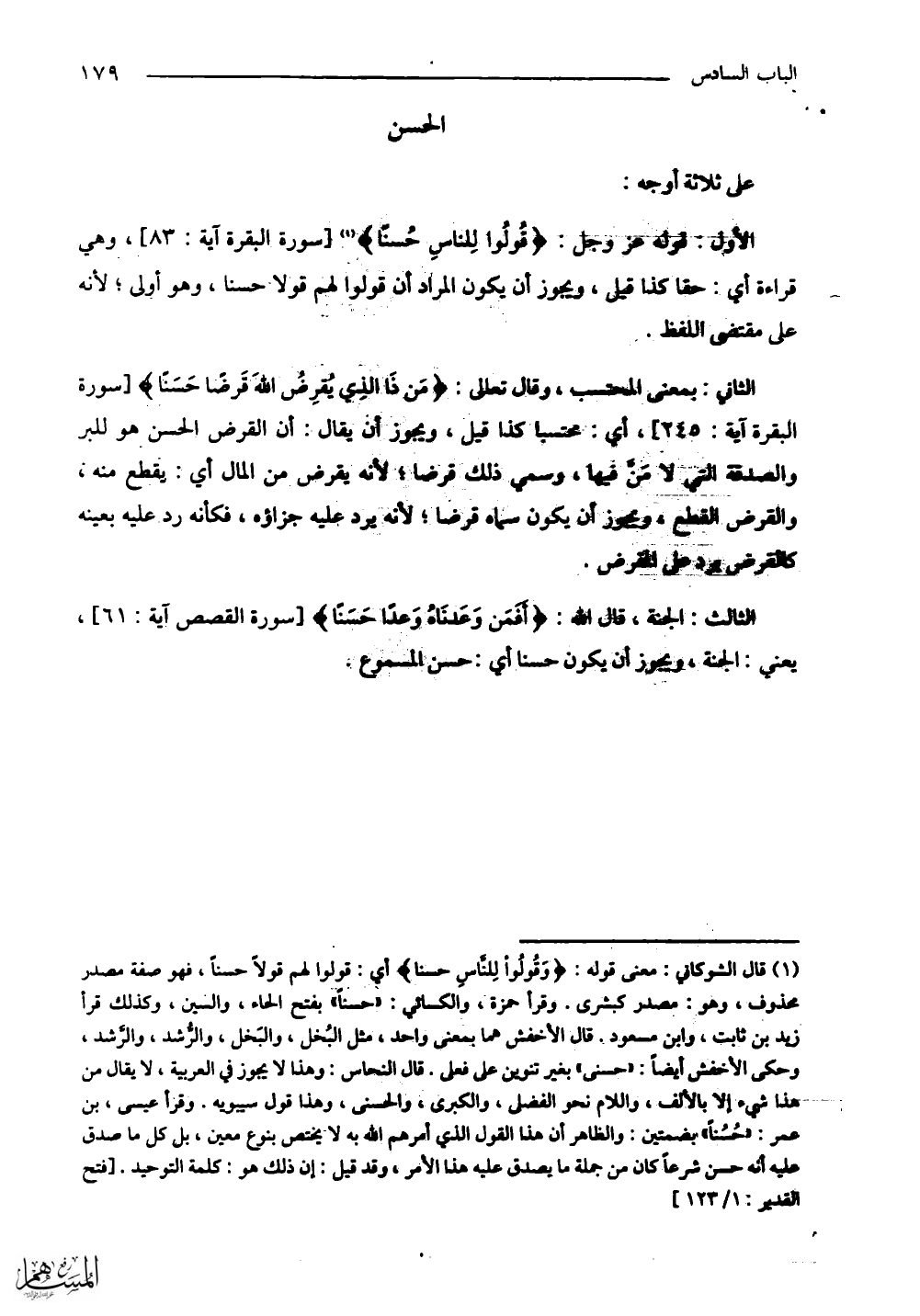 الأول قوله - عز وجل -: (وَقُولُوا لِلنَّاسِ حُسْنًا) وهي قراءة أي: حقا كذا قيل، ويجوز أن يكون المراد أن قولوا لهم قولا حسنا، وهو أولى؛ لأنه عل مقتضى اللفظ.