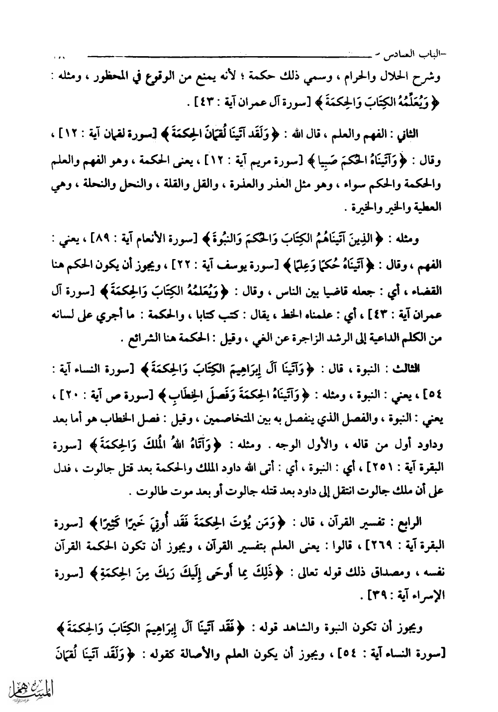 ومثله: (الَّذِينَ آتَيْنَاهُمُ الْكِتَابَ وَالْحُكْمَ وَالنُّبُوَّةَ) يعني: الفهم، وقال: (آتَيْنَاهُ حُكْمًا وَعِلْمًا) ويجوز أن يكون الحكم هنا القضاء، أي: جعله قاضيا بين الناس، وقال: (وَيُعَلِّمُهُ الْكِتَابَ وَالْحِكْمَةَ) أي: علمناه الخط، يقال: كتب كتابا، والحكمة: ما أجري على لسانه من الكلم الداعية إلى الرشد الزاجرة عن الغي، وقيل: الحكمة هنا الشرائع.