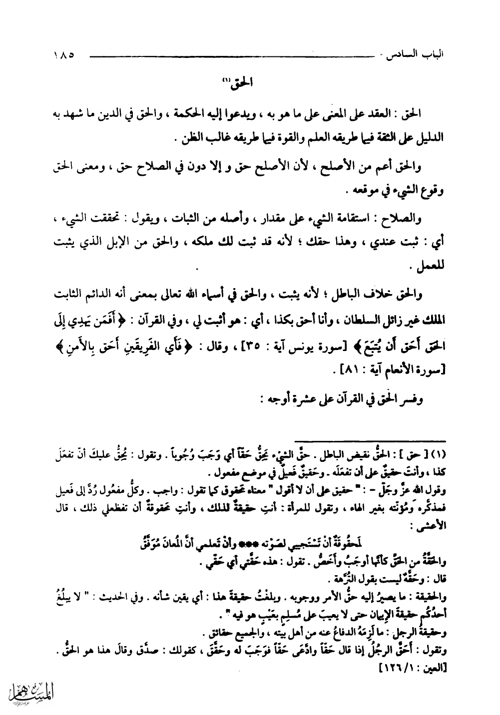 وفسر الحق في القرآن على عشرة أوجه: ......