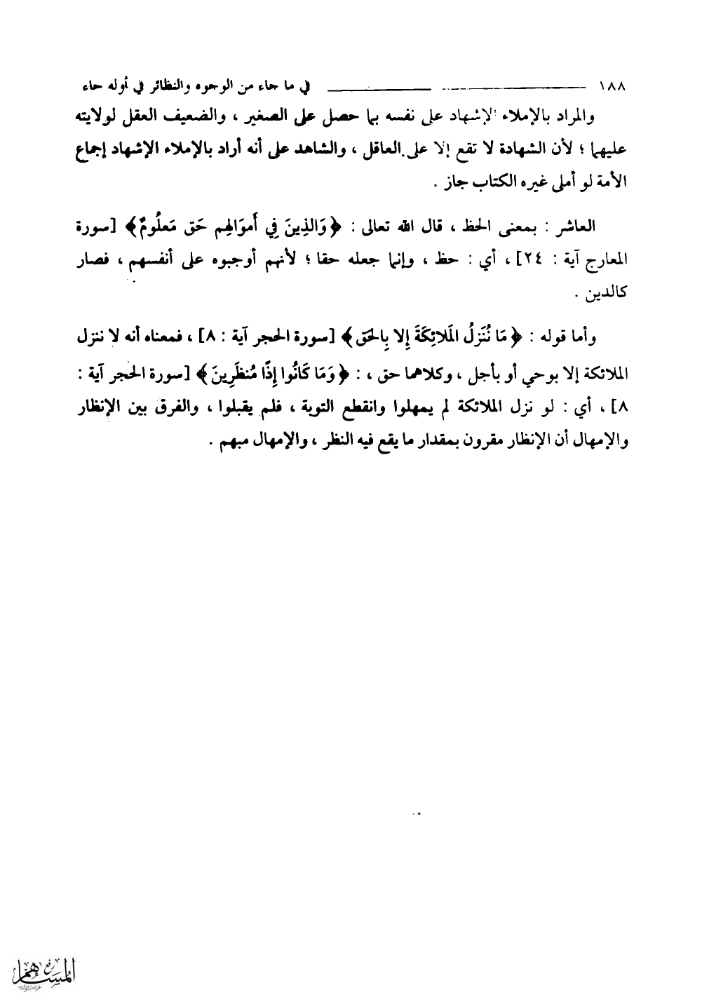 العاشر: بمعنى الحظ، قال الله تعالى: (وَالَّذِينَ فِي أَمْوَالِهِمْ حَقٌّ مَعْلُومٌ) أي: حظ، وإنما جعله حقا؛ لأنهم أوجبوه على أنفسهم، فصار كالدَّين.