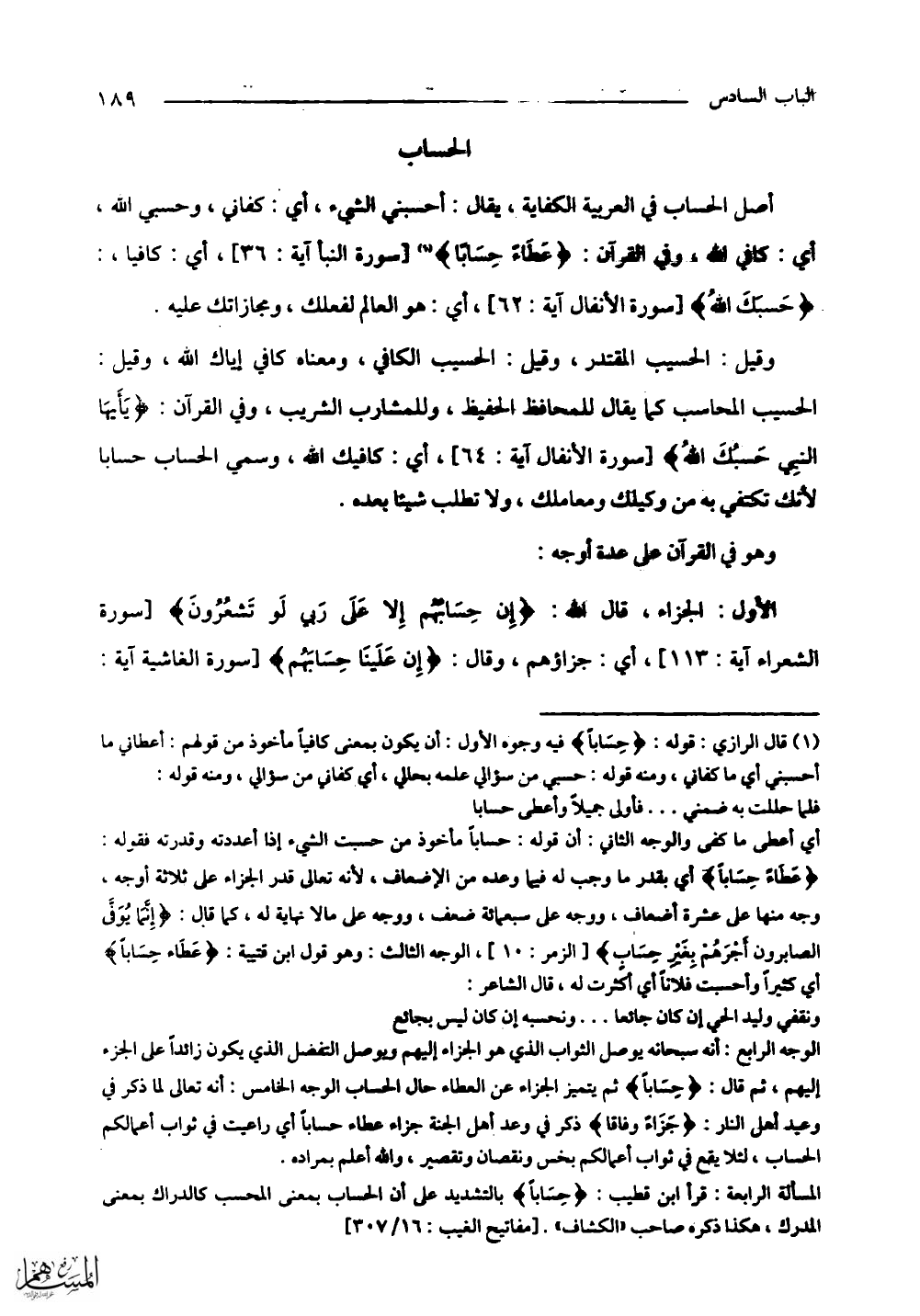 الأول: الجزاء، قال الله: (إِنْ حِسَابُهُمْ إِلَّا عَلَى رَبِّي) أي: جزاؤهم، وقال: (إِنَّ عَلَيْنَا حِسَابَهُمْ) ......