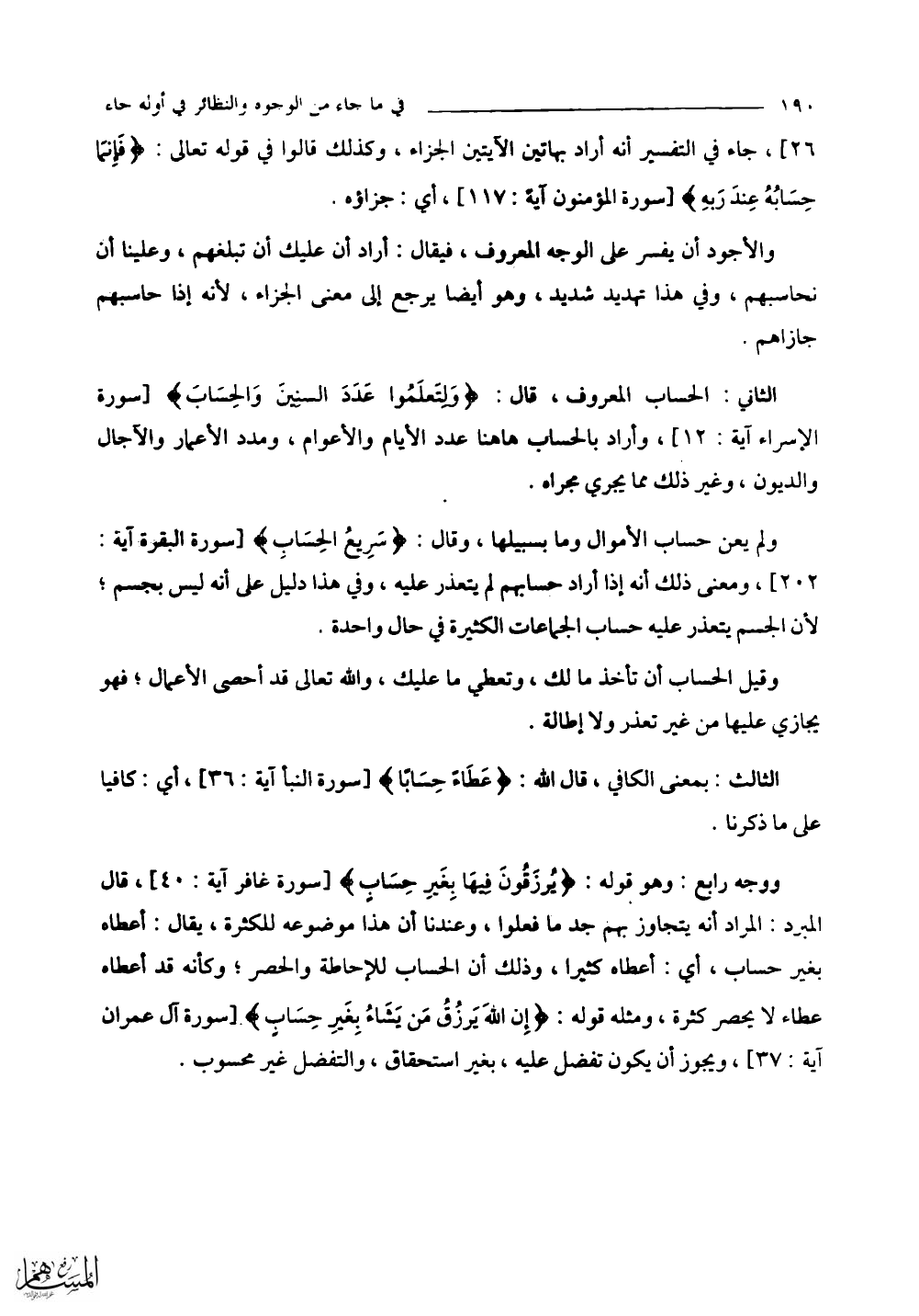 الثالث: بمعنى الكافي، قال الله: (عَطَاءً حِسَابًا) أي: كافيا على ما ذكرنا.