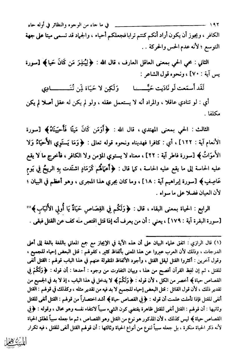 الرابع: الحياة بمعنى البقاء، قال: (وَلَكُمْ فِي الْقِصَاصِ حَيَاةٌ يَا أُولِي الْأَلْبَابِ) يعني: أن من يعرف أنه إذا قتل اقتُصَّ منه كفَّ عن القتل فبقى