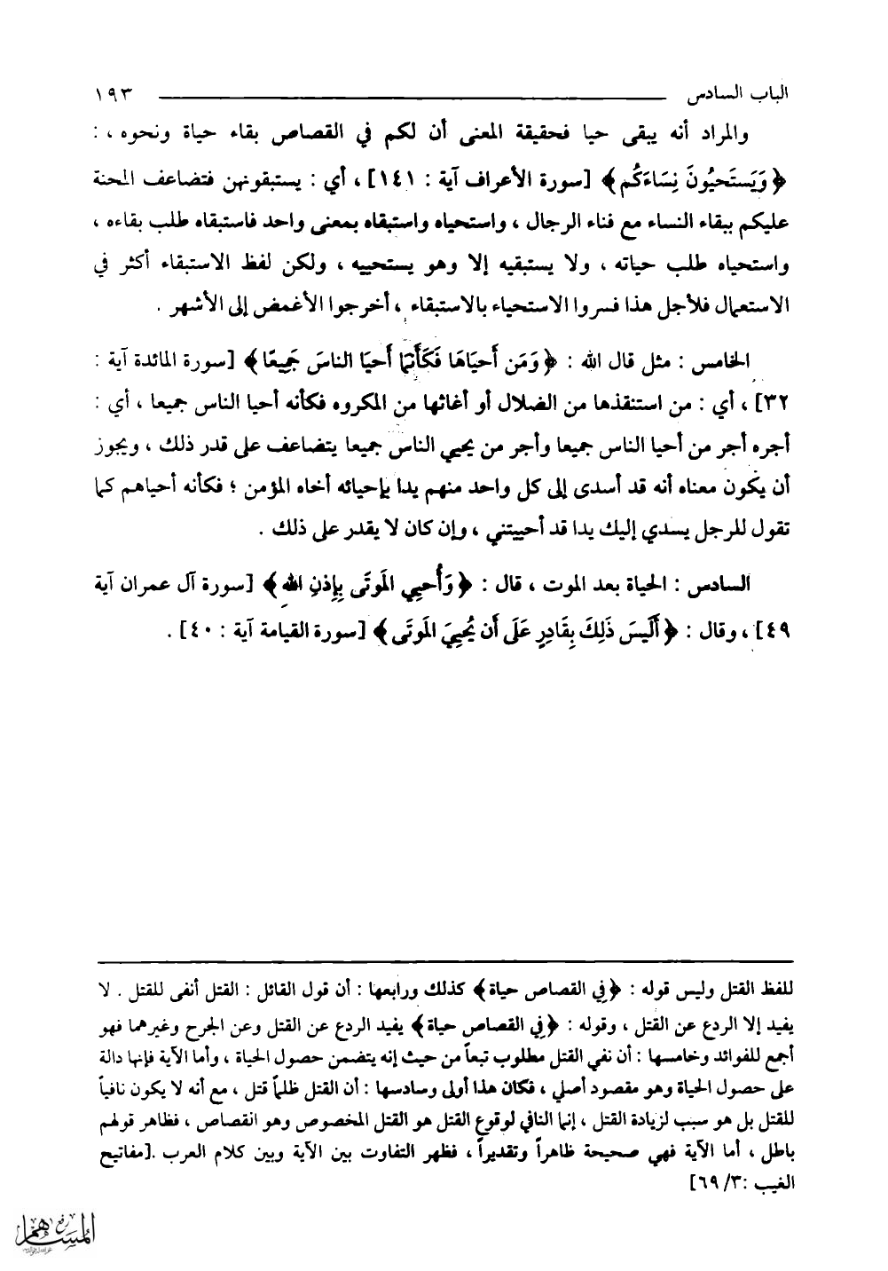 والمراد أنه يبقى حيًّا فحقيقة المعنى أن لكم في القصاص بقاء حياة ونحوه،: (وَيَسْتَحْيُونَ نِسَاءَكُمْ) أي: يستبقونهن فتضاعف المحنة عليكم ببقاء النساء مع فناء الرجال، واستحياه واستبقاه بمعنى واحد فاستبقاه طلب بقاءه، واستحياه طلب حياته، ولا يستبقيه إلا وهو يستحييه، ولكن لفظ الاستبقاء أكثر في الاستعمال فلأجل هذا فسروا الاستحياء بالاستبقاء، أخرجوا الأغمض إلى الأشهر.