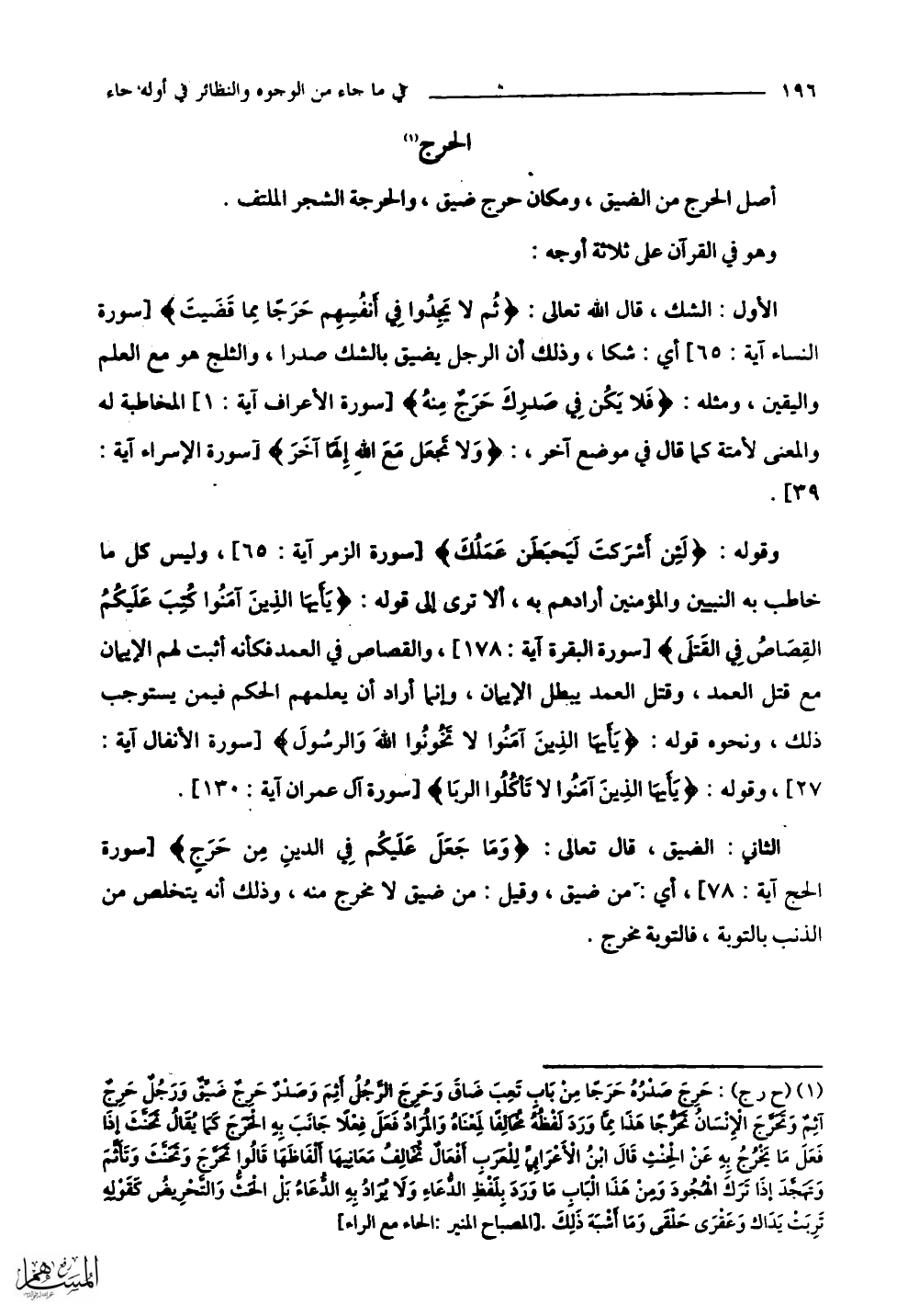 الثاني: الضيق، قال تعالى: (وَمَا جَعَلَ عَلَيْكُمْ فِي الدِّينِ مِنْ حَرَجٍ) أي: - من ضيق، وقيل: من ضيق لا مخرج منه، وذلك أنه يتخلص من الذنب بالتوبة، فالتوبة مخرج