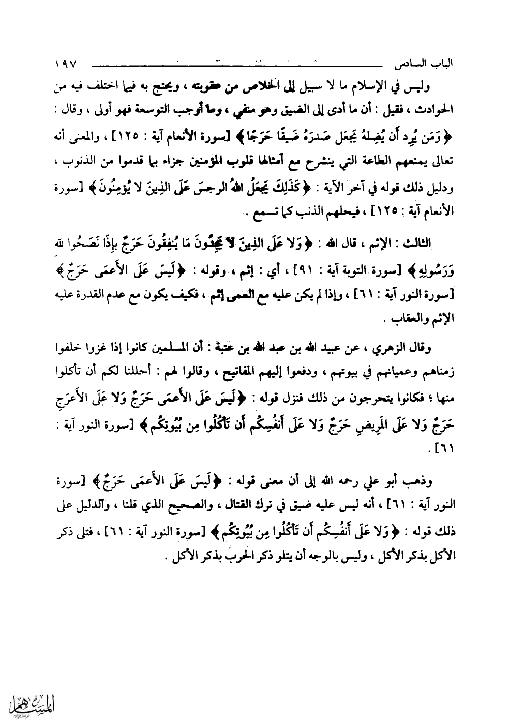 وذهب أبو علي رحمه الله إلى أن معنى قوله: (لَيْسَ عَلَى الْأَعْمَى حَرَجٌ) أنه ليس عليه ضيق في ترك القتال، والصحيح الذي قلنا، والدليل على ذلك قوله: (وَلَا عَلَى أَنْفُسِكُمْ أَنْ تَأْكُلُوا مِنْ بُيُوتِكُمْ) فتلى ذكر الأكل بذكر الأكل، وليس بالوجه أن يتلو ذكر الحرب بذكر الأكل