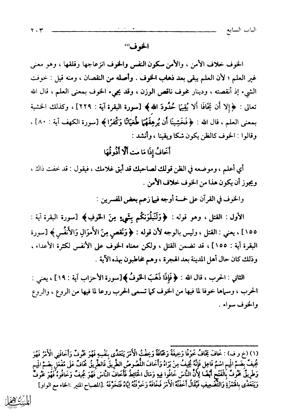 والخوف في القرآن على خمسة أوجه في زعم بعض المفسرين: