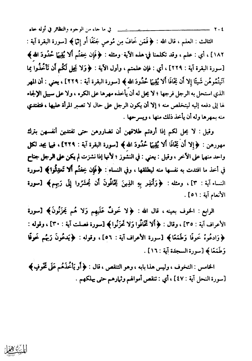 الثالث: العلم، قال الله: (فَمَنْ خَافَ مِنْ مُوصٍ جَنَفًا أَوْ إِثْمًا) أي: علم، وقد تكلمنا في هذه الآية. ومثله: (فَإِنْ خِفْتُمْ أَلَّا يُقِيمَا حُدُودَ اللَّهِ) أي: فإن علمتم، وأول الآية: (وَلَا يَحِلُّ لَكُمْ أَنْ تَأْخُذُوا مِمَّا آتَيْتُمُوهُنَّ شَيْئًا إِلَّا أَنْ يَخَافَا أَلَّا يُقِيمَا حُدُودَ اللَّهِ) يعني: أن المهر الذي استحل به الرجل فرجها؛ لا يحل له أن [يأخذ] مهرها على الكره، ولا على سبيل الإلجاء لها إلى دفعه إليه ليتخلص منه؛ إلا أن يكون الرجل على حال لا تصبر المرأة عليها، فتفتدي منه بمهرها وله أن يأخذ ذلك منها، ويسرحها.