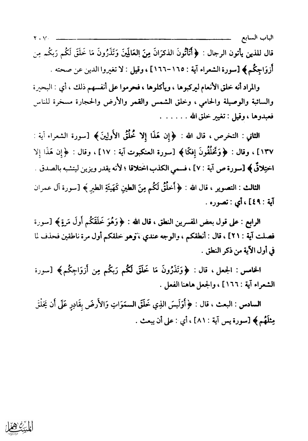 السادس: البعث، قال: (أَوَلَيْسَ الَّذِي خَلَقَ السَّمَاوَاتِ وَالْأَرْضَ بِقَادِرٍ عَلَى أَنْ يَخْلُقَ مِثْلَهُمْ) أي: على أن يبعث