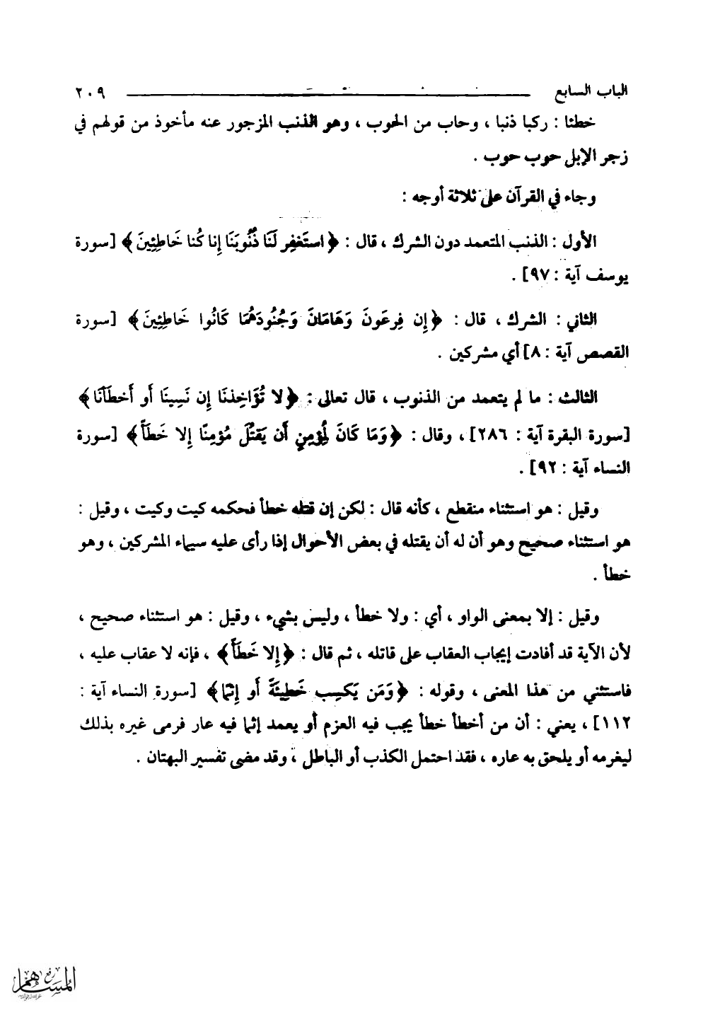وقيل: (إلا) بمعنى (الواو)، أي: ولا خطأ، وليس بشيء، وقيل: هو استثناء صحيح، لأن الآية قد أفادت إيجاب العقاب على قاتله، ثم قال: (إِلَّا خَطَأً)، فإنه لا عقاب عليه، فاستثني من هذا المعنى، وقوله: (وَمَنْ يَكْسِبْ خَطِيئَةً أَوْ إِثْمًا) يعنى: أن من أخطأ خطأ يجب فيه العزم أو يعمد إثما فيه عار فرمى غيره بذلك ليغرمه أو يلحق به عاره، فقد احتمل الكذب أو الباطل: وقد مضى تفسير البهتان