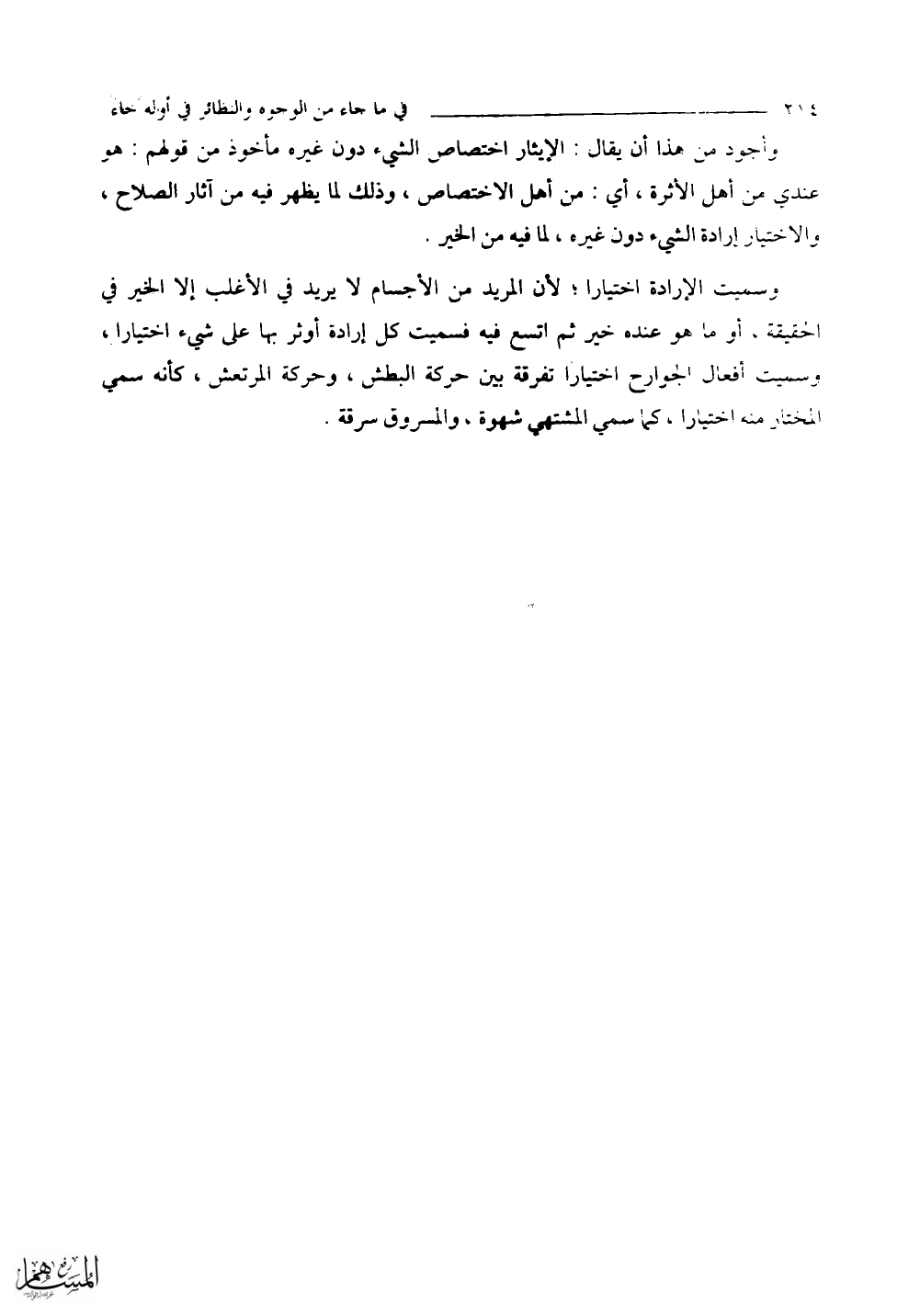 وسميت الإرادة اختيارا؛ لأن المريد من الأجسام لا يريد في الأغلب إلا الخير في الحقيقة. أو ما هو عنده خير ثم اتسع فيه فسميت كل إرادة أوثر بها على شيء اختيارا، وسميت أفعال الجوارح اختيارا تفرقة بين حركة البطش، وحركة المرتعش، كأنه سمي المختار من اختيارا، كما سمي المشتهي شهوة، والمسروق سرقة