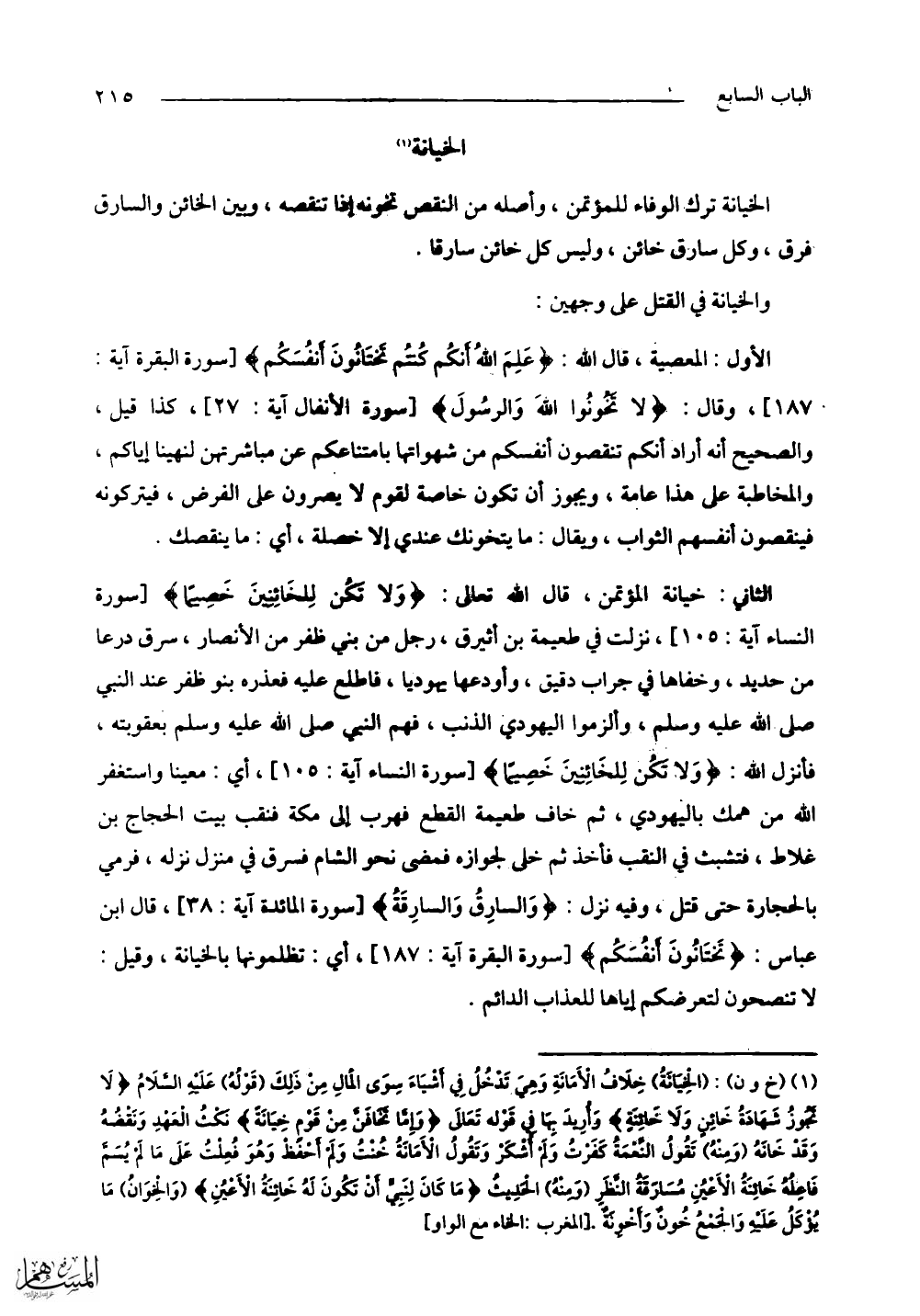 الثاني: خيانة المؤتمن، قال الله تعالى: (وَلَا تَكُنْ لِلْخَائِنِينَ خَصِيمًا) نزلت في [طُعْمَةَ بْنِ أُبَيْرِقٍ]، رجل من بني ظفر من الأنصار، سرق درعا من حديد، وأخفاها في جراب دقيق، وأودعها يهوديا، فاطلع عليه فعذره بنو ظفر عند النبي - صلى الله عليه وسلم -، وألزموا اليهودي الذنب، فهمَّ النبي - صلى الله عليه وسلم - بعقوبته، فأنزل اللَّه: (وَلَا تَكُنْ لِلْخَائِنِينَ خَصِيمًا) أي: معينا واستغفر اللَّه من همِّك باليهودي، ثم خاف [طُعْمَةُ] القطع فهرب إلى مكة فنقب بيت الحجاج بن غلاط، فتشبث في النقب فأخذ ثم خلي لجواره فمضى نحو الشام فسرق في منزل نزله، فرمي بالحجارة حتى قتل، وفيه نزل: (وَالسَّارِقُ وَالسَّارِقَةُ) قال ابن عباس: (تَختَانُونَ أنفُسَكُم) أي: تظلمونها بالخيانة، وقيل: لا تنصحون لتعرضكم إياها للعذاب الدائم