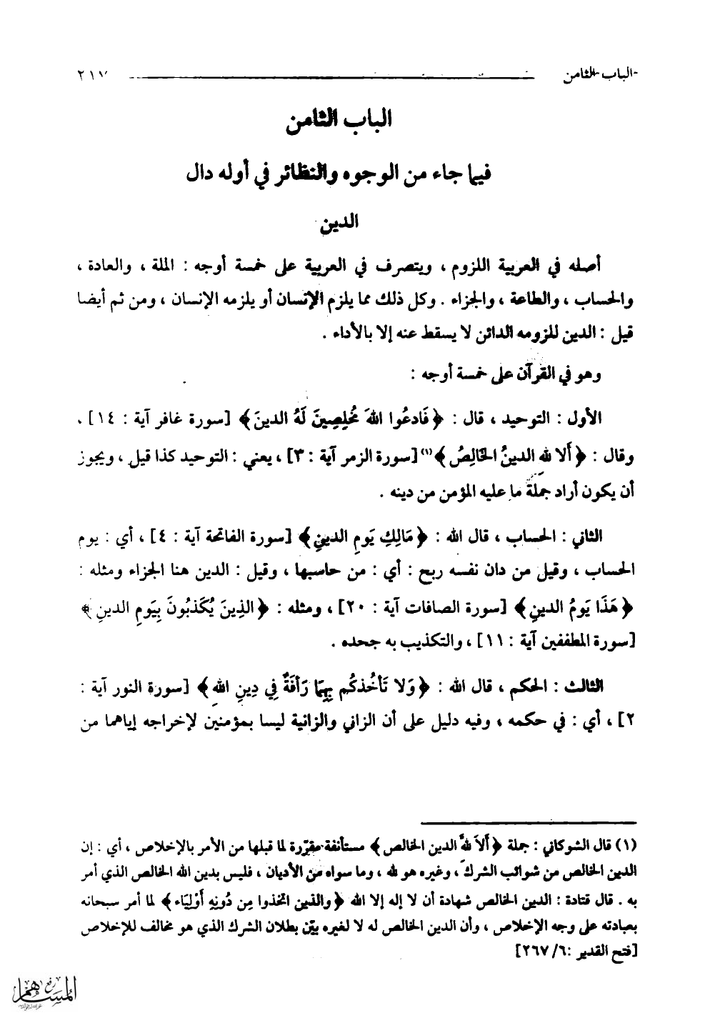 الثاني: الحساب، قال الله: (مَالِكِ يَوْمِ الدِّينِ) أي: يوم الحساب، وقِيل من دان نفسه ربح: أي: من حاسبها، وقيل: الدين هنا الجزاء ومثله (هَذَا يَومُ الدِّينِ) ومثله: (الَّذِينَ يُكَذِّبُونَ بِيَوْمِ الدِّينِ) والتكذيب به جحده.