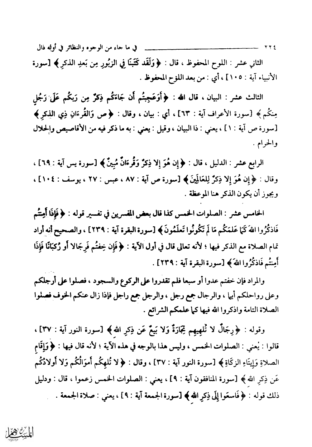 وقوله: (رِجَالٌ لَا تُلْهِيهِمْ تِجَارَةٌ وَلَا بَيْعٌ عَنْ ذِكْرِ اللَّهِ) قالوا: يعني: الصلوات الخمس، وليس هذا بالوجه في هذه الآية؛ لأنه قال فيها: (وَإِقَامِ الصَّلَاةِ وَإِيتَاءِ الزَّكَاةِ) وقال: (لَا تُلْهِكُمْ أَمْوَالُكُمْ وَلَا أَوْلَادُكُمْ عَنْ ذِكْرِ اللَّهِ) يعني: الصلوات الخمس زعموا، قال: ودليل ذلك قوله، (فَاسْعَوْا إِلَى ذِكْرِ اللَّهِ) يعني: صلاة الجمعة