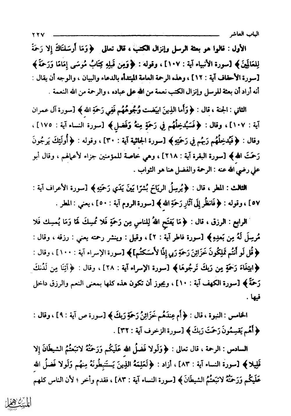 السادس: الرحمة، قال تعالى: (وَلَوْلَا فَضْلُ اللَّهِ عَلَيْكُمْ وَرَحْمَتُهُ لَاتَّبَعْتُمُ الشَّيْطَانَ إِلَّا قَلِيلًا) [أراد]: (لَعَلِمَهُ الَّذِينَ يَسْتَنْبِطُونَهُ مِنْهُمْ وَلَوْلَا فَضْلُ اللَّهِ عَلَيْكُمْ وَرَحْمَتُهُ لَاتَّبَعْتُمُ الشَّيْطَانَ) فقدم وأخر؛ لأن الناس كلهم ......