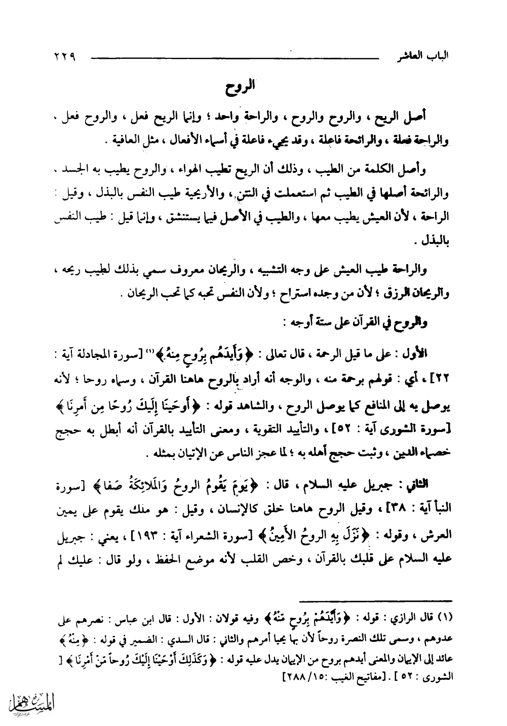 الأول: على ما قيل الرحمة، قال تعالى: (وَأَيَّدَهُمْ بِرُوحٍ مِنْهُ) أي: قولهم برحمة منه، والوجه أنه أراد بالروح هاهنا القرآن، وسماه روحا؛ لأنه يوصل به إلى المنافع كما يوصل الروح، والشاهد قوله: (أَوْحَيْنَا إِلَيْكَ رُوحًا مِنْ أَمْرِنَا) والتأييد التقوية، ومعنى التأييد بالقرآن أنه أبطل به حجج خصماء الدِّين، وثبت حجج أهله به؛ لما عجز الناس عن الإتيان بمثله.