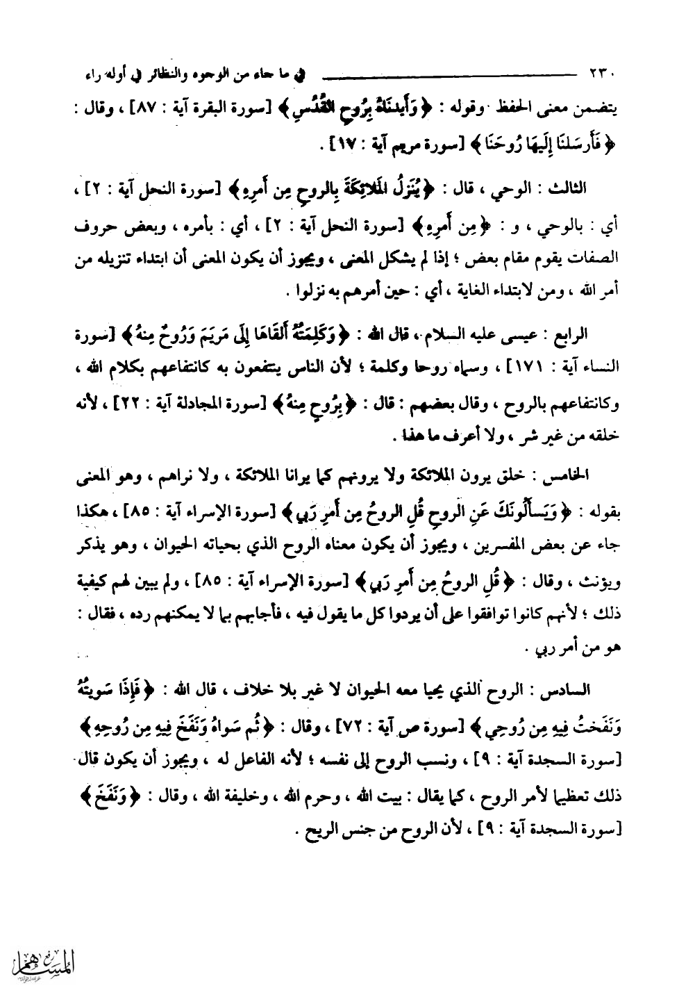 الرابع: عيسى - عليه السلام -، قال اللَّه: (وَكَلِمَتُهُ أَلْقَاهَا إِلَى مَرْيَمَ وَرُوحٌ مِنْهُ) وسماه روحا وكلمة؛ لأن الناس ينتفعون به كانتفاعهم بكلام اللَّه، وكانتفاعهم بالروح، وقال بعضهم: قال: (بِرُوحٍ مِنْهُ)؛ لأنه خلقه من غير شر، ولا أعرف ما هذا.