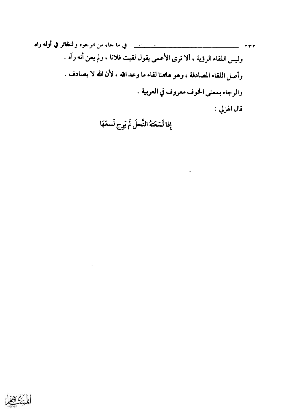 (¬1) دسيسة اعتزالية. حاصلها الرد على أهل السنة في احتجاجهم لرؤية المؤمنين ربهم تبارك وتعالى في الجنة، (الَّذِينَ يَظُنُّونَ أَنَّهُمْ مُلَاقُو رَبِّهِمْ وَأَنَّهُمْ إِلَيْهِ رَاجِعُونَ) حيث إن اللقاء يستلزم الرؤية، والمؤلف - رحمه الله - محجوج بقول الله تعالى (وُجُوهٌ يَوْمَئِذٍ نَاضِرَةٌ (22) إِلَى رَبِّهَا نَاظِرَةٌ (23)، وبما رواه البخاري عَنْ جَرِيرِ بْنِ عَبْدِ اللَّهِ، قَالَ: كُنَّا عِنْدَ النَّبِيِّ صَلَّى اللهُ عَلَيْهِ وَسَلَّمَ، فَنَظَرَ إِلَى القَمَرِ لَيْلَةً - يَعْنِي البَدْرَ - فَقَالَ: «إِنَّكُمْ سَتَرَوْنَ رَبَّكُمْ، كَمَا تَرَوْنَ هَذَا القَمَرَ، لاَ تُضَامُّونَ فِي رُؤْيَتِهِ، فَإِنِ اسْتَطَعْتُمْ أَنْ لاَ تُغْلَبُوا عَلَى صَلاَةٍ قَبْلَ طُلُوعِ الشَّمْسِ وَقَبْلَ غُرُوبِهَا فَافْعَلُوا» ثُمَّ قَرَأَ: {وَسَبِّحْ بِحَمْدِ رَبِّكَ قَبْلَ طُلُوعِ الشَّمْسِ وَقَبْلَ الغُرُوبِ}. فتأمل. اهـ (مصحح النسخة الإلكترونية)