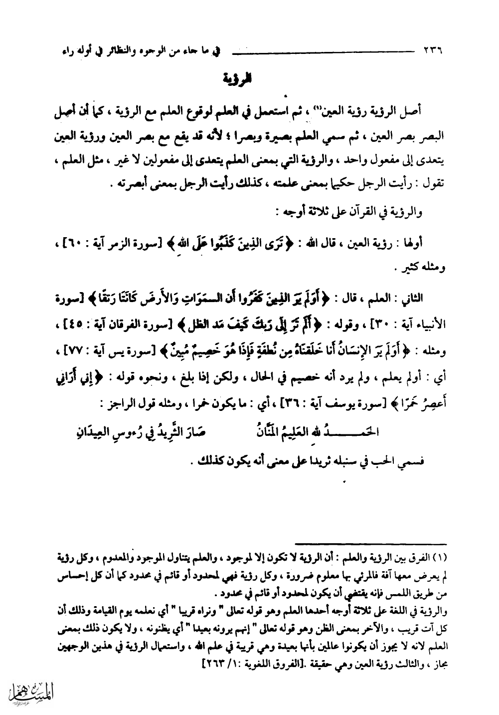الثاني: العلم، قال: (أَوَلَمْ يَرَ الَّذِينَ كَفَرُوا أَنَّ السَّمَاوَاتِ وَالْأَرْضَ كَانَتَا رَتْقًا) وقوله (أَلَمْ تَرَ إِلَى رَبِّكَ كَيْفَ مَدَّ الظِّلَّ) ومثله: (أَوَلَمْ يَرَ الْإِنْسَانُ أَنَّا خَلَقْنَاهُ مِنْ نُطْفَةٍ فَإِذَا هُوَ خَصِيمٌ مُبِينٌ) أي: أولم يعلم، ولم يرد أنه خصيم في الحال، ولكن إذا بلغ، ونحوه قوله: (إِنِّي أَرَانِي أَعْصِرُ خَمْرًا) أي: ما يكون خمرا، ومثله قول الراجز: