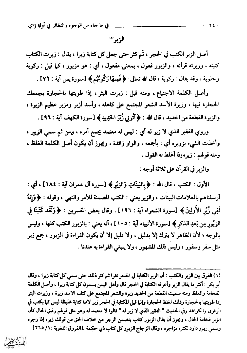 الأول: الكتب، قال الله: (بِالْبَيِّنَاتِ وَالزُّبُرِ) أي: أرسلناهم بالعلامات البينات، والزبر يعني: الكتب المضمنة للأمر والنهي، وقوله:، (وَإِنَّهُ لَفِي زُبُرِ الْأَوَّلِينَ). وقال بعض المفسرين: (وَلَقَدْ كَتَبْنَا فِي الزَّبُورِ مِنْ بَعْدِ الذِّكْرِ) أنه يعني: بالزبور الكتب كلها، وليس بالوجه؛ لأن الظاهر لا يترك إلا بديل، ولا دليل إلا أن يكون القراءة في الزبور، جمع زبر مثل سفر وسفور، وليس ذلك المشهور، ولا ينبغي القراءة به عندنا