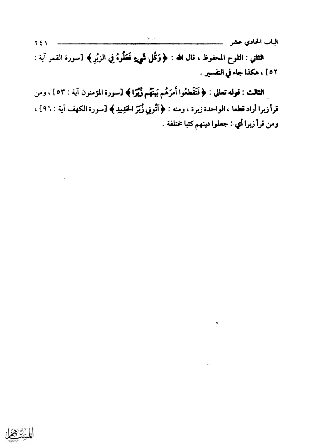 الثالث: قوله تعالى: (فَتَقَطَّعُوا أَمْرَهُمْ بَيْنَهُمْ زُبُرًا) ومن قرأ زبرا أراد قطعا، الواحدة زبرة، ومنه: (آتُونِي زُبَرَ الْحَدِيدِ) ومن قرأ زبرا أي: جعلوا دينهم كتبا مختلفة
