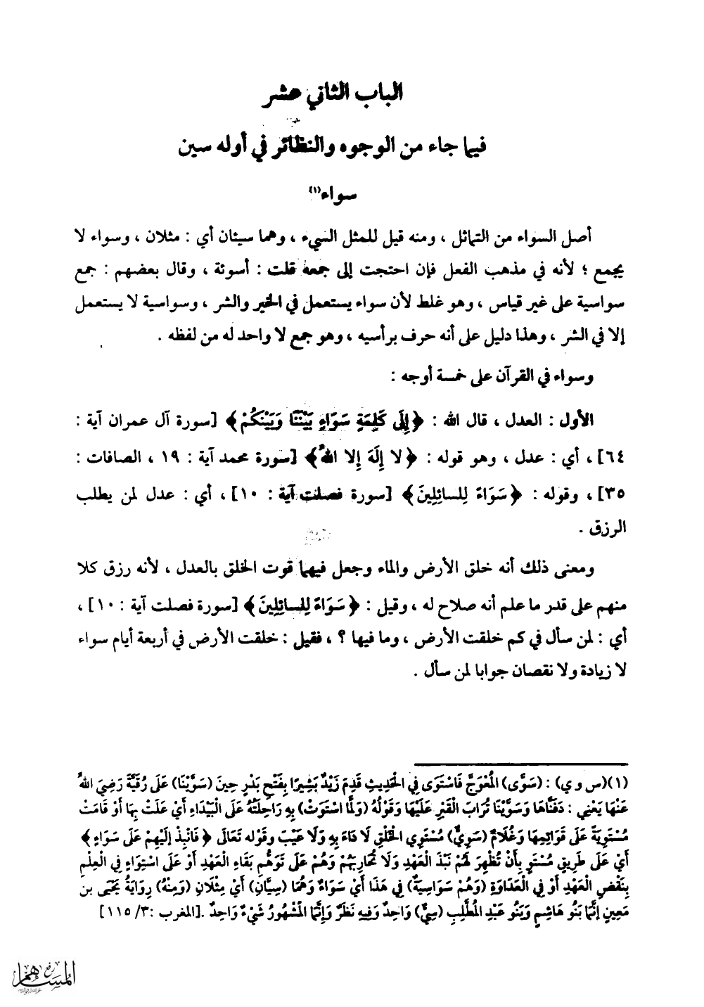 الأول: العدل، مال اللَّه: (إِلَى كَلِمَةٍ سَوَاءٍ بَيْنَنَا وَبَيْنَكُمْ) أي: عدل، وهو قوله: (لا إِلَهَ إِلا الله) وقوله: (سَوَاءً لِلسَّائِلِينَ) أي: عدل لمن يطلب الرزق.