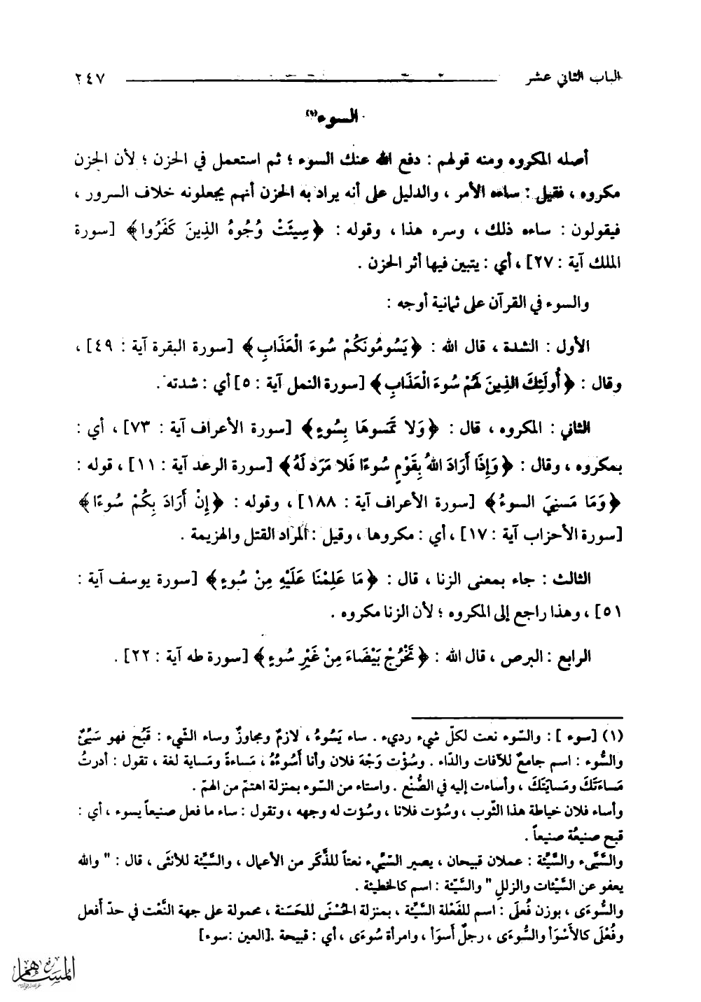 الثاني: المكروه، قال: (وَلَا تَمَسُّوهَا بِسُوءٍ) أي: بمكروه، وقال: (وَإِذَا أَرَادَ اللَّهُ بِقَوْمٍ سُوءًا فَلَا مَرَدَّ لَهُ) قوله: (وَمَا مَسَّنِيَ السُّوءُ) وقوله: (إِنْ أَرَادَ بِكُمْ سُوءًا) أي: مكروها، وقيل: المراد القتل والهزيمة.