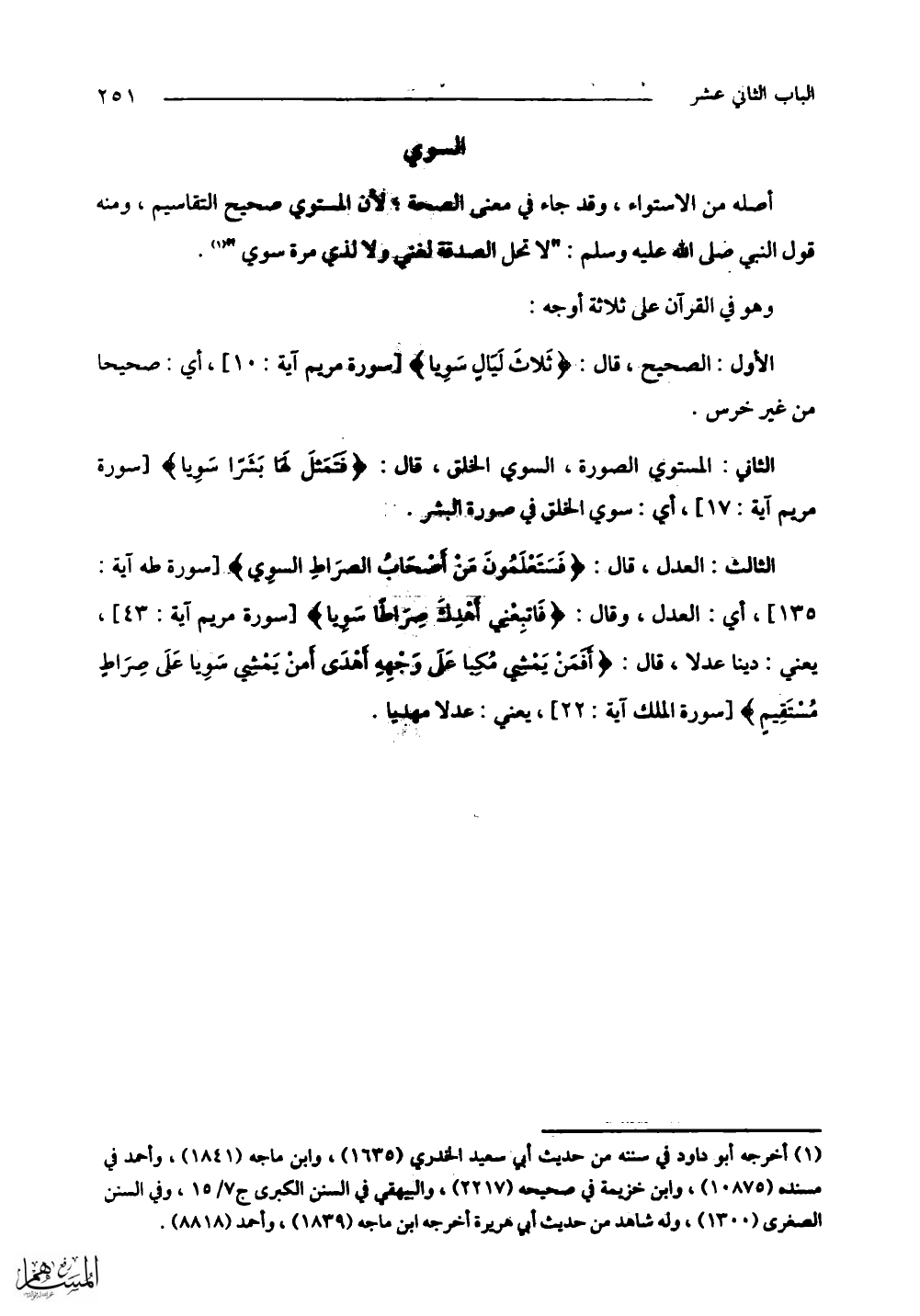 الثالث: العدل، قال: (فَسَتَعْلَمُونَ مَنْ أَصْحَابُ الصِّرَاطِ السَّوِيِّ) أي: العدل، وقال: (فَاتَّبِعْنِي أَهْدِكَ صِرَاطًا سَوِيًّا) يعني: دينا عدلا، قال: (أَفَمَنْ يَمْشِي مُكِبًّا عَلَى وَجْهِهِ أَهْدَى أَمَّنْ يَمْشِي سَوِيًّا عَلَى صِرَاطٍ مُسْتَقِيمٍ) يعني: عدلا مهديا