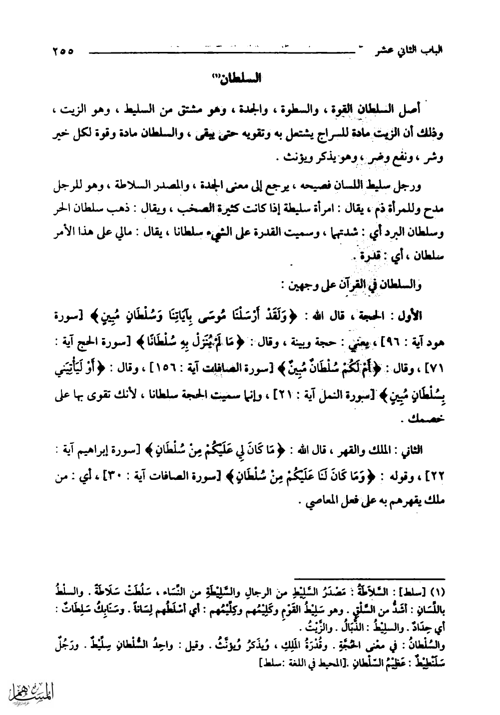 الأول: الحجة، قال الله: (وَلَقَدْ أَرْسَلْنَا مُوسَى بِآيَاتِنَا وَسُلْطَانٍ مُبِينٍ) يعني: حجة وبينة، وقال: (مَا لَمْ يُنَزِّلْ بِهِ سُلْطَانًا) وقال: (أَمْ لَكُمْ سُلْطَانٌ مُبِينٌ) وقال: (أَوْ لَيَأْتِيَنِّي بِسُلْطَانٍ مُبِينٍ)، وإنَّمَا سميت الحجة سلطانا، لأنك تقوى بها على خصمك.
