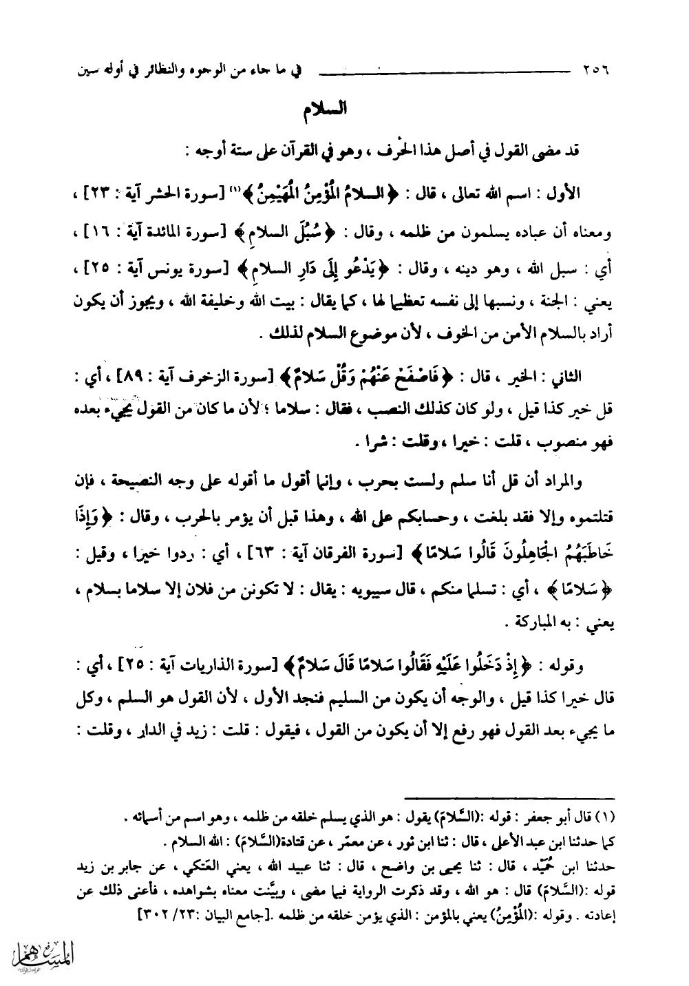الأول: اسم اللَّه تعالى، قال: (السَّلَامُ الْمُؤْمِنُ الْمُهَيْمِنُ) ومعناه أن عباده يسلمون من ظلمه، وقال: (سُبُلَ السَّلَامِ) أي: سبل الله، وهو دينه، وقال: (يَدْعُو إِلَى دَارِ السَّلَامِ) يعني: الجنة، ونسبها إلى نفسه تعظيما لها، كما يقال: بيت الله وخليفة اللَّه، ويجوز أن يكون أراد بالسلام الأمن من الخوف، لأن موضوع السلام لذلك.