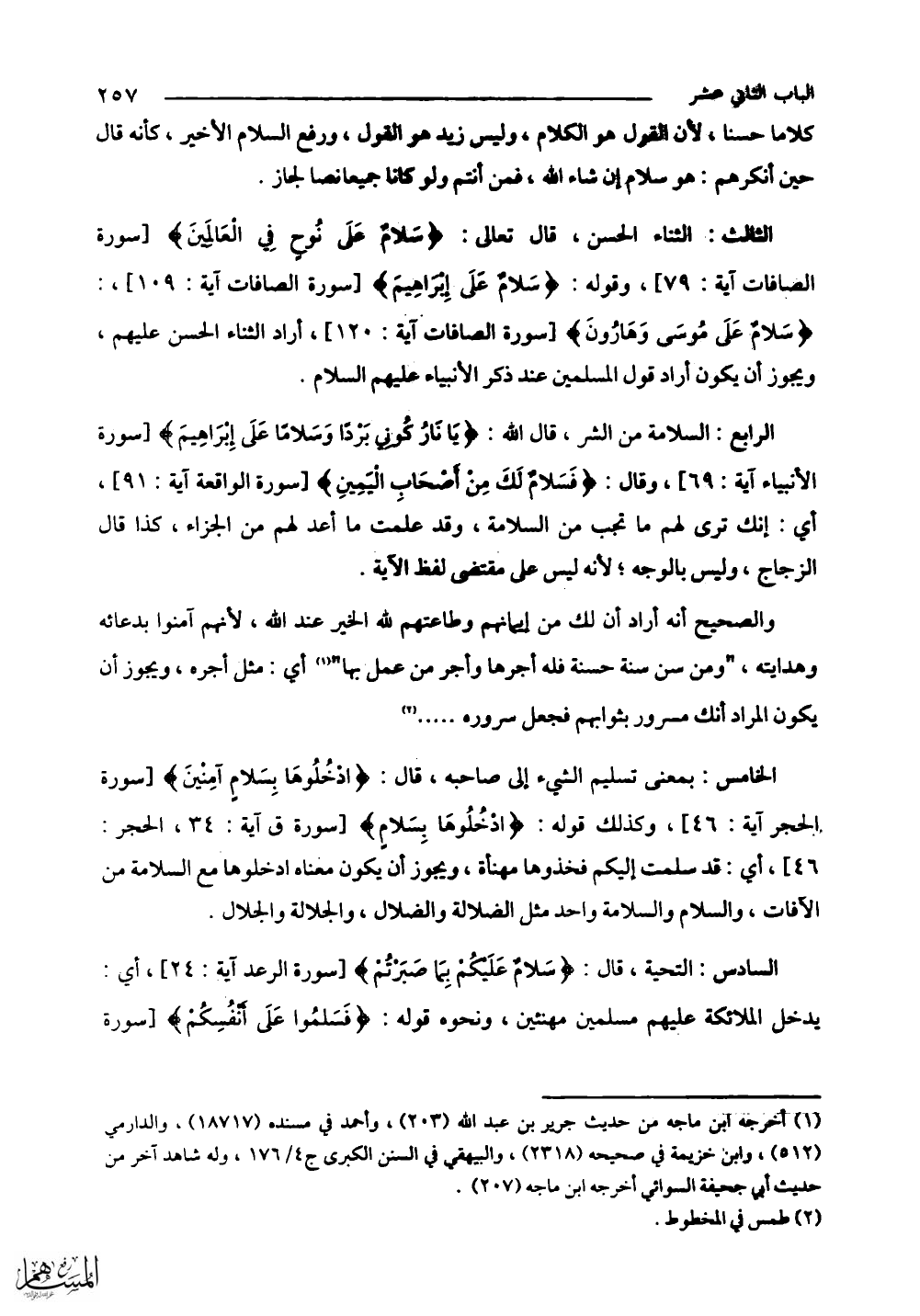الثالث: الثناء الحسن، قال تعالى:: (سَلَامٌ عَلَى نُوحٍ فِي الْعَالَمِينَ) وقوله: (سَلَامٌ عَلَى إِبْرَاهِيمَ) (سَلَامٌ عَلَى مُوسَى وَهَارُونَ) أراد الثناء الحسن عليهم، ويجوز أن يكون أراد قول المسلمين عند ذكر الأنبياء عليهم السلام.