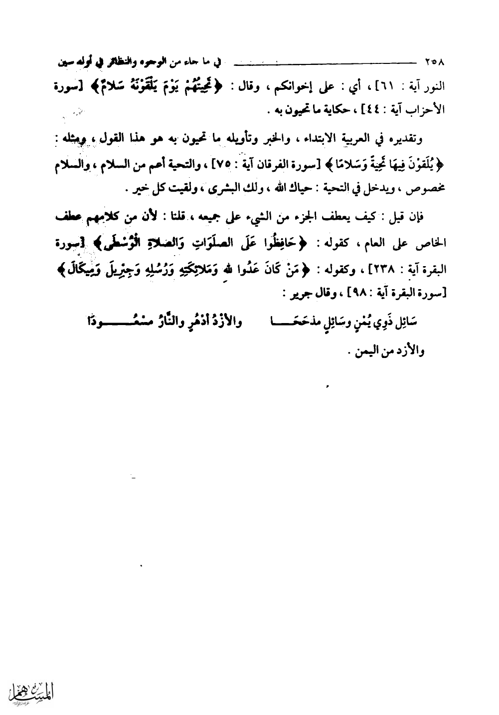 فإن قيل: كيف يعطف الجزء من الشيء على جميعه؟ قلنا: لأن من كلامهم عطف الخاص على العام، كقوله: (حَافِظُوا عَلَى الصَّلَوَاتِ وَالصَّلَاةِ الْوُسْطَى). وكقوله: (مَنْ كَانَ عَدُوًّا لِلَّهِ وَمَلَائِكَتِهِ وَرُسُلِهِ وَجِبْرِيلَ وَمِيكَالَ) وقال جرير: