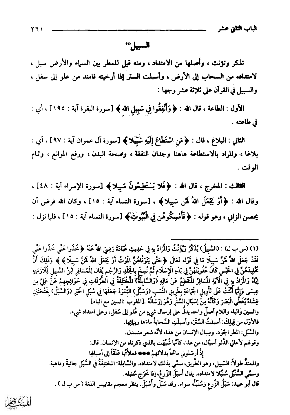 تذكر وتونث، وأصلها من الامتداد، ومنه قيل للمطر بين السماء والأرض سبل، لامتداده من السحاب إلى الأرض، وأسبلت الستر إذا أرخيته فامتد من علو إلى سفل، والسبيل في القرآن على ثلاثة عشر وجها: