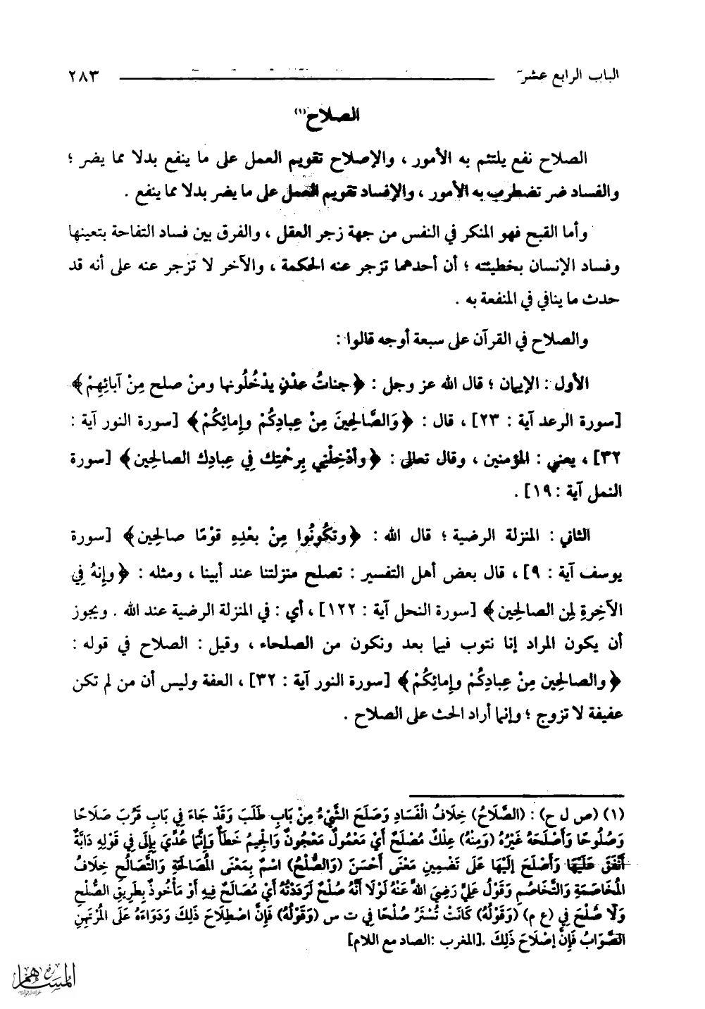 الثاني: المنزلة الرضية؛ قال الله: (وَتَكُونُوا مِنْ بَعْدِهِ قَوْمًا صَالِحِينَ) قال بعض أهل التفسير: تصلح منزلتنا عند أبينا، ومثله: (وَإِنَّهُ فِي الْآخِرَةِ لَمِنَ الصَّالِحِينَ) أي: في المنزلة الرضية عند الله. ويجوز أن يكون المراد إنا نتوب فيما بعد ونكون من الصلحاء، وقيل: الصلاح في قوله: (وَالصَّالِحِينَ مِنْ عِبَادِكُمْ وَإِمَائِكُمْ) العفة وليس أن من لم تكن عفيفة لا تزوج؛ وإنما أراد الحث على الصلاح.