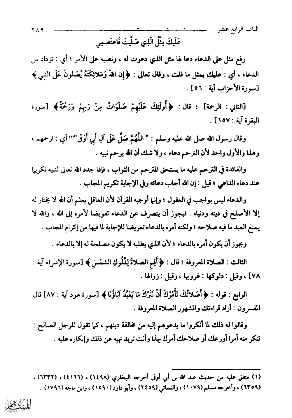 وقال رسول الله - صلى الله عليه وسلم -: " اللهُم صلِّ عَلى آلِ أبِي أوفَى " أي: ارحمهم، وهذا والأول واحد؛ لأن الترحم دعاء، ولا شك أن الله يرحم نبيه.