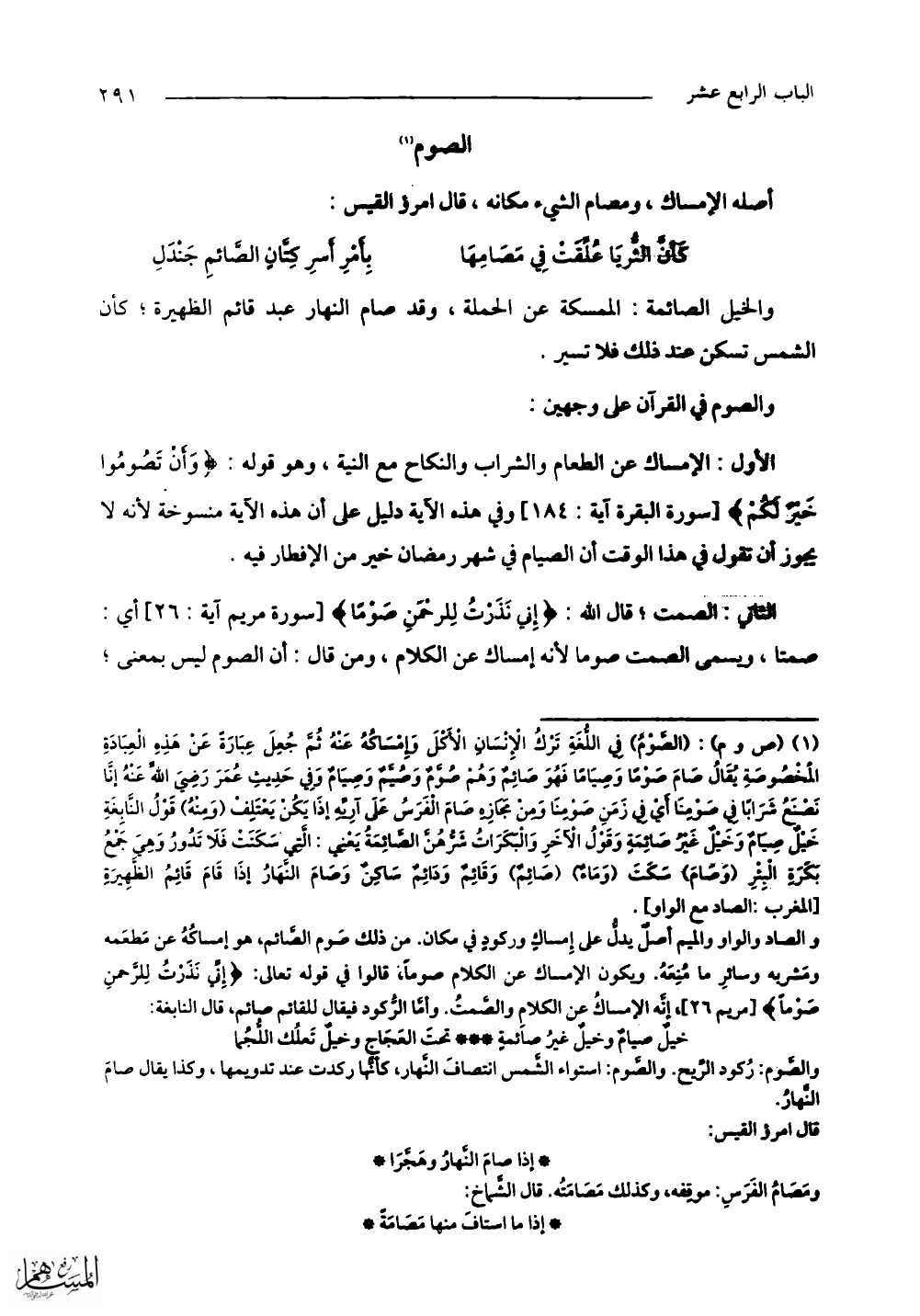 الثاني: الصمت؛ قال اللَّه: (إِنِّي نَذَرْتُ لِلرَّحْمَنِ صَوْمًا) أي: صمتا، ويسمى الصمت صوما لأنه إمساك عن الكلام، ومن قال: إن الصوم ليس بمعنى؛ ......
