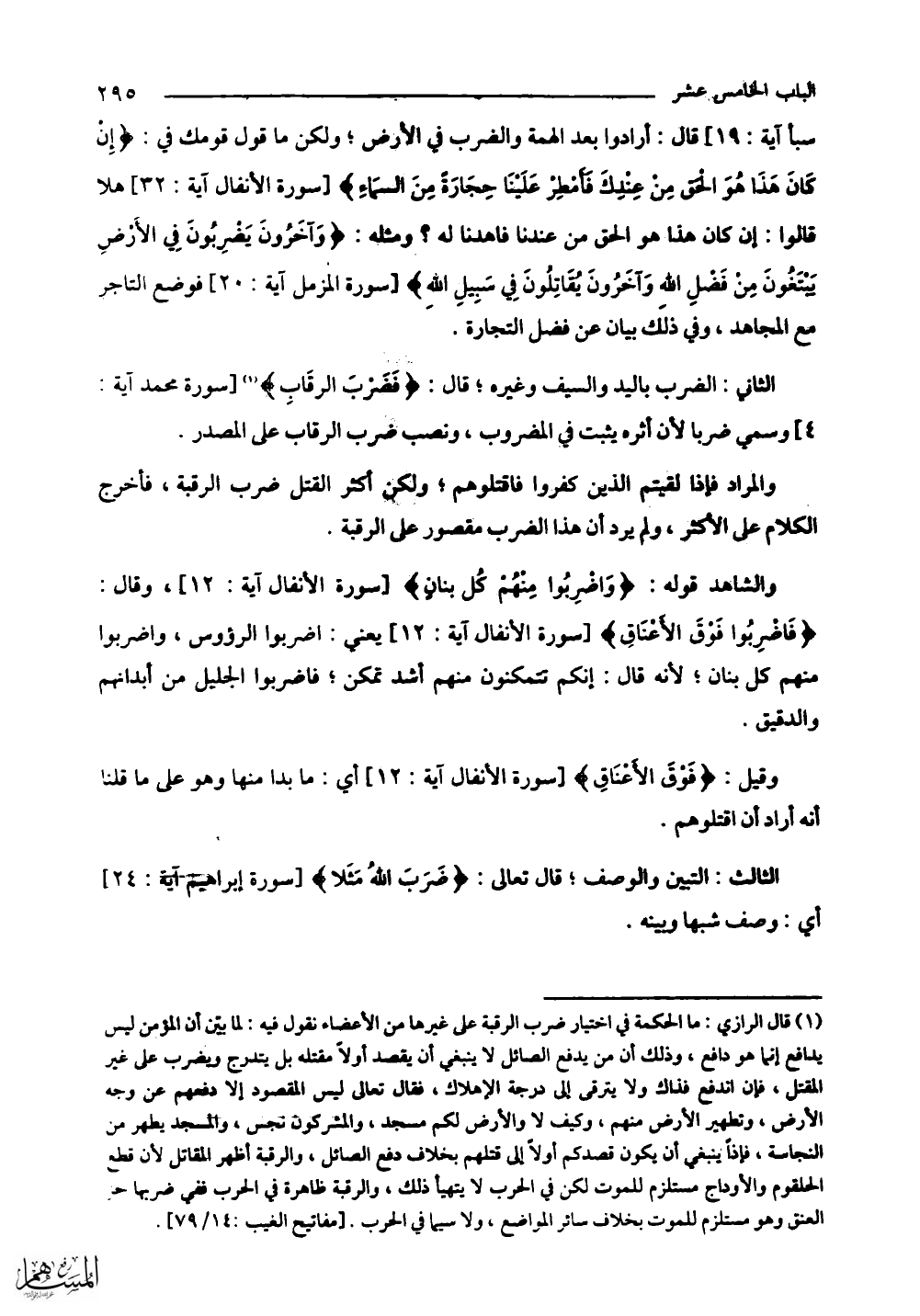والمراد فإذا لقيتم الذين كفروا فاقتلوهم؛ ولكن أكثر القتل ضرب الرقبة، فأخرج الكلام على الأكثر، ولم يرد وأن هذا الضرب مقصور على الرقبة.