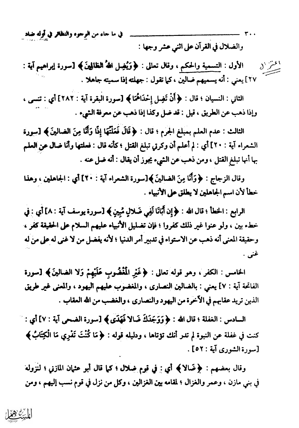 وقال بعضهم: (ضَالًّا) أي: في قوم ضُلَّال كما قال أبو عثمان المازني؛ لنزولة في بني مازن، وعمر والغزال؛ لمقامه بين الغزالين، وكل من نزل في قوم نسب إليهم، ومن