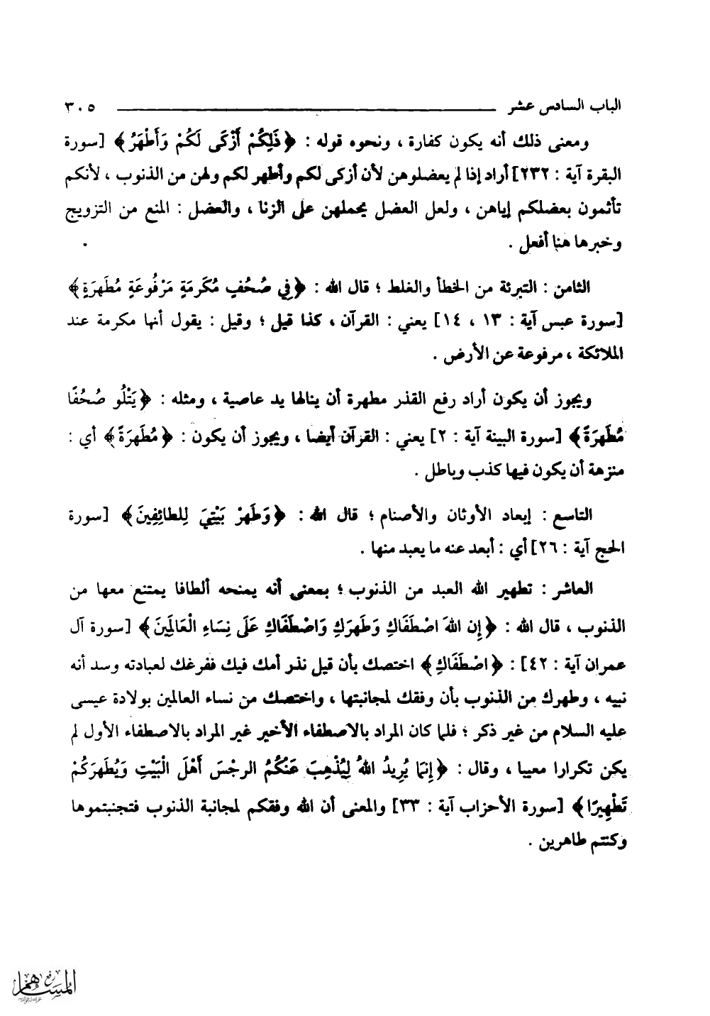 العاشر: تطهير الله العبد من الذنوب؛ بمعني أنه يمنحه ألطافا يمتنع معها من الذنوب، قال اللَّه: (إِنَّ اللَّهَ اصْطَفَاكِ وَطَهَّرَكِ وَاصْطَفَاكِ عَلَى نِسَاءِ الْعَالَمِينَ) (اصْطَفَاكِ) اختصك بأن قَبِل نذر أمك فيك ففرغك لعبادته [وسدانة بيته] (¬1)، وطهرك من الذنوب بأن وفقك لمجانبتها، واختصك من نساء العالمين بولادة عيسى - عليه السلام - من غير ذكر؛ فلما كان المراد بالاصطفاء الأخير غير المراد بالاصطفاء الأول لم يكن تكرارا معيبا، وقال: (إِنَّمَا يُرِيدُ اللَّهُ لِيُذْهِبَ عَنْكُمُ الرِّجْسَ أَهْلَ الْبَيْتِ وَيُطَهِّرَكُمْ تَطْهِيرًا) والمعنى أن اللَّه وفقكم لمجانبة الذنوب فتجنبتموها وكنتم طاهرين.