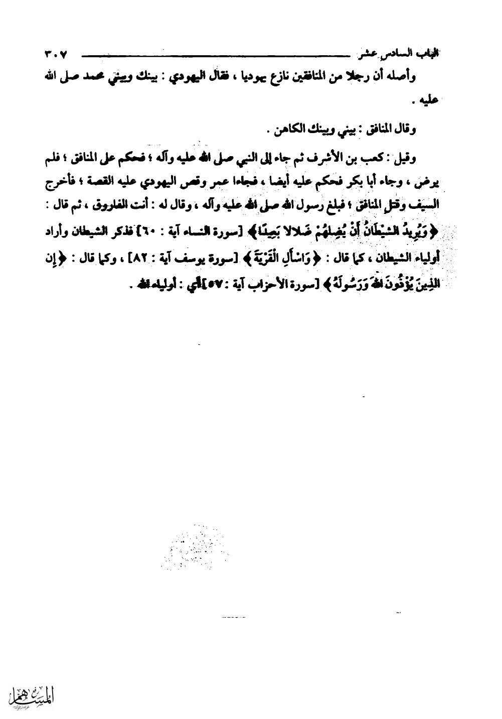 وقيل: كعب بن الأشرف ثم جاء إلى النبي - صلى الله عليه وسلم - فحكم على المنافق، فلم يرض، وجاء أبا بكر فحكم عليه أيضا، فجاءا عمر وقص اليهودي عليه القصة، فأخرج السيف وقته المنافق، فبلغ رسول الله - صلى الله عليه وسلم - وقال له: (أنت الفاروق، ثم قال: (وَيُرِيدُ الشَّيْطَانُ أَنْ يُضِلَّهُمْ ضَلَالًا بَعِيدًا) فذكر الشيطان وأراد ْأولياء الشيطان كما قال: (وَاسْأَلِ الْقَرْيَةَ)، وكما قال: (إِنَّ الَّذِينَ يُؤْذُونَ اللَّهَ وَرَسُولَهُ) أي أولياء الله.