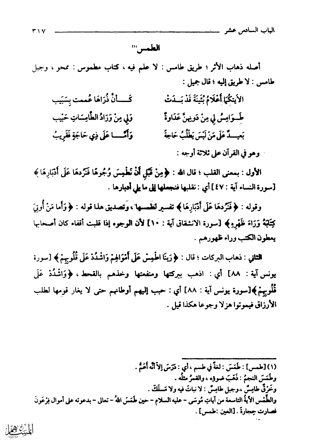 أصله ذهاب الأثر؛ طريق طامس: لا علم فيه، كتاب مطموس: ممحو، وجبل طامس: لا طريق إليه؛ قال جميل: